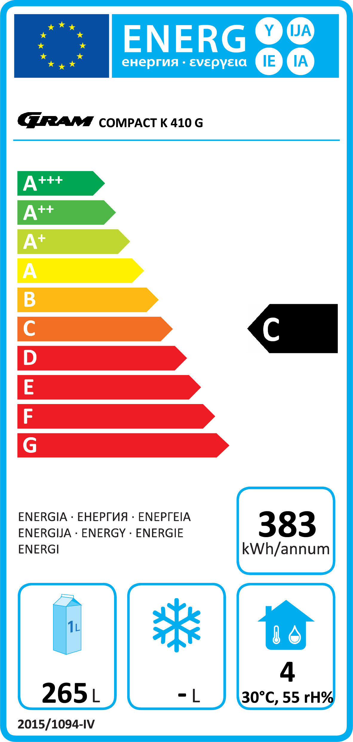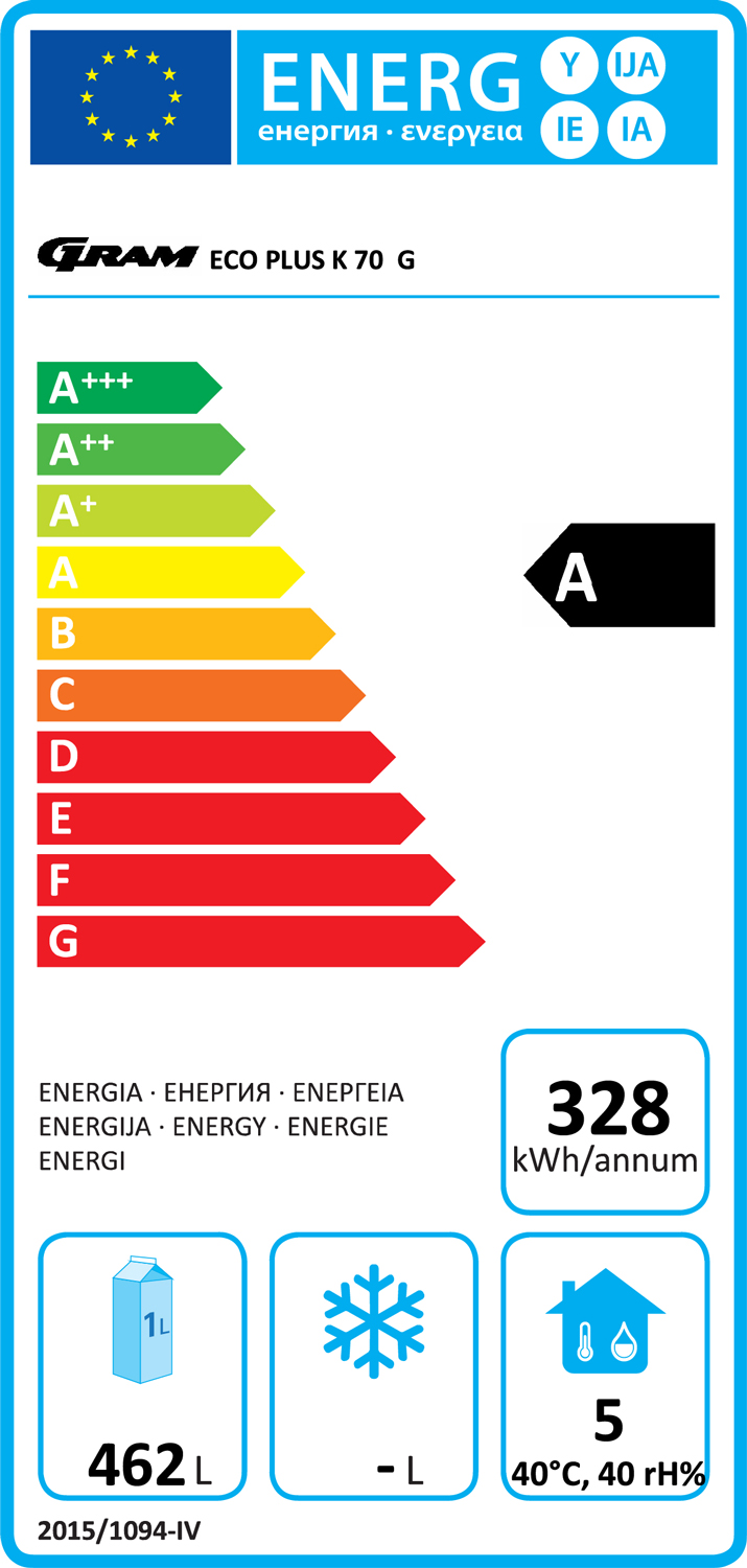 Alle professionelle køle- og fryseskabe skal være mærket med skabets energieffektivitet. Skalaen går fra A til G, hvor A er det mest energieffektive. GRAM køleskabe fra Superior Plus- og Eco Plus-serien er alle udstyret med energimærke A med et energiforbrug, der er det absolut mindste på markedet.