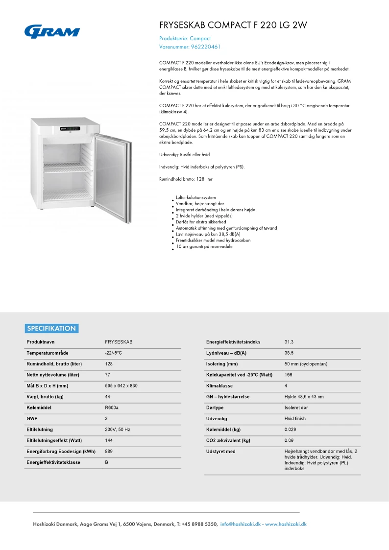 Hvidlakeret kabinet og dør. Hvid ABS indvendigt. Højrehængt vendbar dør med lås. Touchpanel med intuitiv betjening og temperaturstyring. Adgang til opsætning af HACCP-alarmer. Udvendigt termometer. 2 grå trådhylder. Temperaturområde -22/-5°C. Bruttoindhold: 128 ltr. Mål: B 595 x D 642 x H 830 mm. El: 230 Volt. 144 watt. Energiforbrug/år: 889 kWh Garanti: 3 år. Specifikationer: Energimærke: C