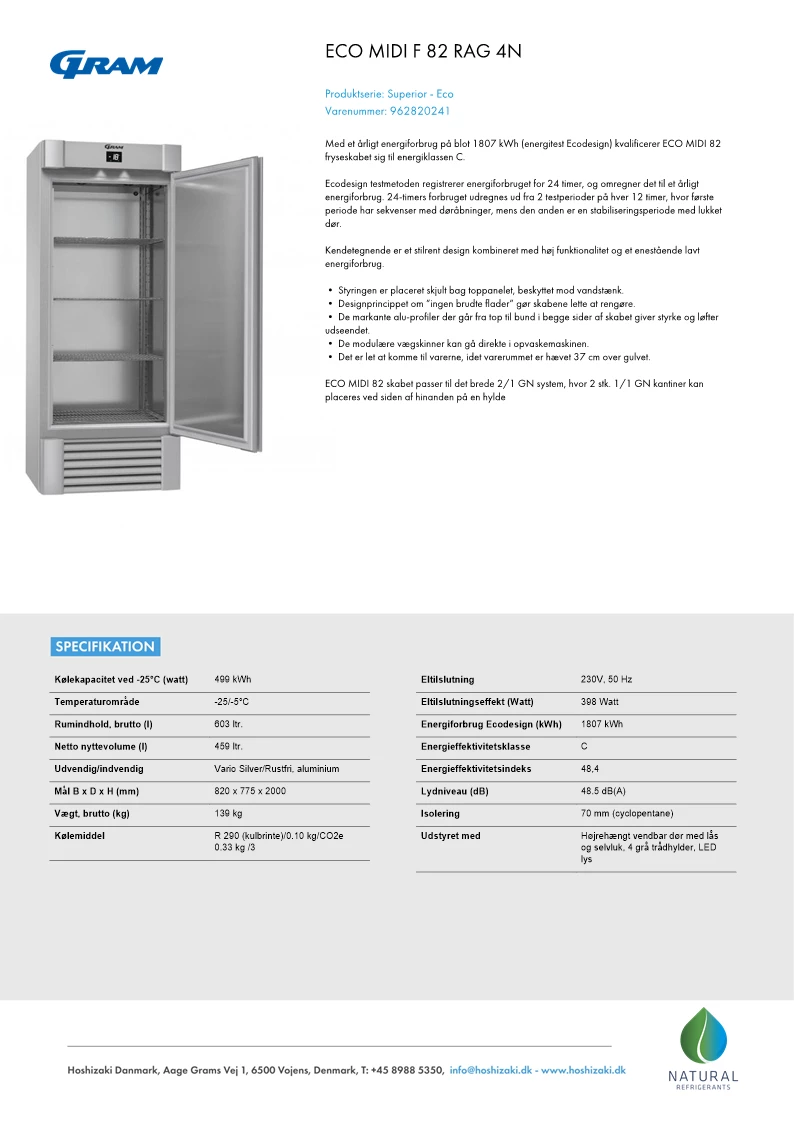 Vario Silver / aluminium. Højrehængt vendbar dør. Lås. 4 plastbelagte trådhylder 2/1 GN Bruttoindhold: 603 ltr. Mål: B 820 x D 771 x H 2000 mm. El: 230 Volt. 50 Hz., 388 Watt. Energiforbrug pr. år 1807 kWh. Garanti: 5 år. Specifikationer: Energimærke: C
