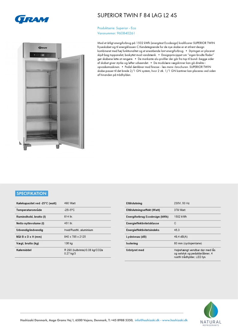 Superlavenergi - energitest EN441, ikrafttræden 1/1 2016. hvid larkeret / aluminium. Højrehængt vendbar dør. Fodpedal-døråbner. Lås. 4 rustfri trådhylder 2/1 GN.