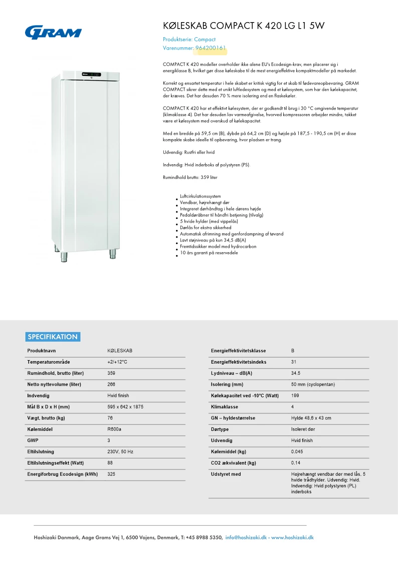 Hvidlakeret. Hvid ABS indvendigt. Højrehængt vendbar dør med lås. Touchpanel med intuitiv betjening og temperaturstyring. Adgang til opsætning af HACCP-alarmer. Udvendigt termometer. Ventileret køling. 5 hvide trådhylder. Temperaturområde +2/+12°C. Bruttoindhold: 359 ltr. Mål: B 595 x D 642 x H 1875 mm. El: 230 Volt. 88 watt. Garanti: 3 år. Specifikationer: Energimærke: B