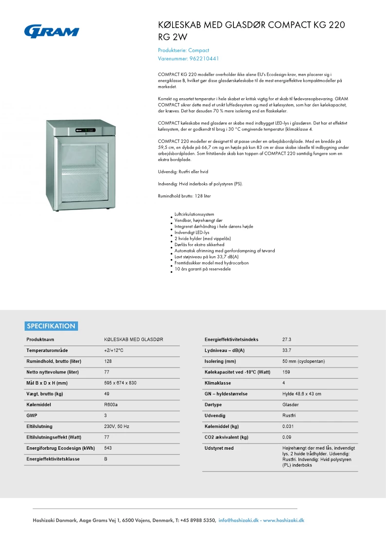 Rustfrit kabinet. Hvid ABS indvendigt. Højrehængt vendbar glasdør med lås. Touchpanel med intuitiv betjening og temperaturstyring. Adgang til opsætning af HACCP-alarmer. Udvendigt termometer. Ventileret køling. 2 hvide trådhylder. Temperaturområde +2/+12°C. Bruttoindhold: 128 ltr. Mål: B 595 x D 642 x H 830 mm. El: 230 Volt. 77 watt. Garanti: 3 år.