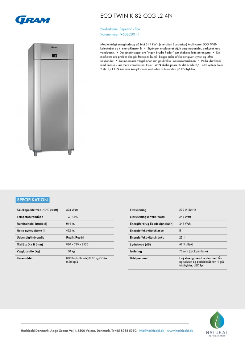 Udført i rustfrit stål udvendigt og indvendigt Temperaturområde: +2 / +12 grader. Indhold: Netto/brutto: 458 / 614 liter. Højrehængt vendbar dør med fodpedal som døråbner. 4 plastbelagte trådhylder 2/1 GN. Str. BxDxH: 820 x 785 x 2125 mm. El: 230 V, 248 W Specifikationer: Energimærke: B