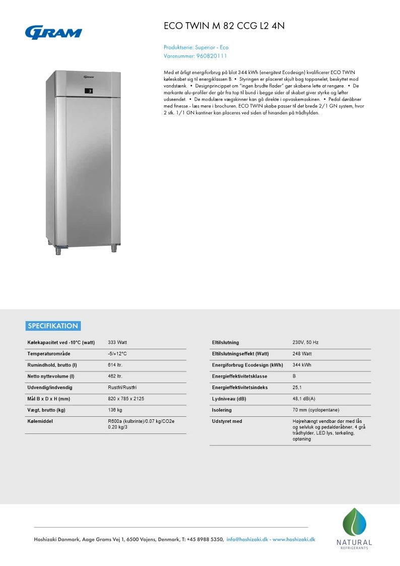 Udført i rustfrit stål udvendigt og indvendigt Temperaturområde: -5 / +12 grader. Indhold: Netto/brutto: 458 / 614 liter. Højrehængt vendbar dør med fodpedal som døråbner. 4 trådhylder for 2/1 GN i rustfrit stål. Str. BxDxH: 820 x 785 x 2125 mm. El: 230 V, 248 SW Specifikationer: Energimærke: B