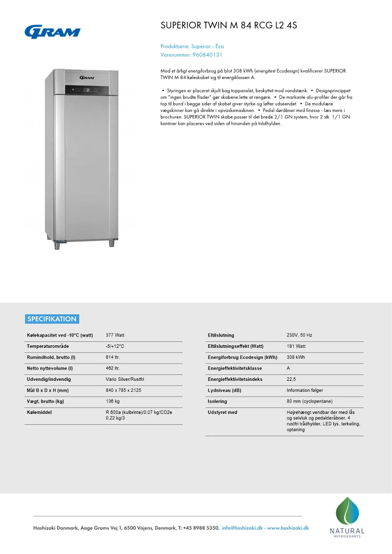 Superlavenergi - energitest EN441, ikrafttræden 1/1 2016. Vario silver /Rustfri stål. Højrehængt vendbar dør. Fodpedal-døråbner. Lås. 4 rustfri trådhylder 2/1 GN. Bruttoindhold: 614 ltr. Udvidet køl -5/+12°C Mål: B 840 x D 785 x H 2125 mm. El: 230 Volt. 50 Hz., 181 Watt. Energiforbrug pr. år 318 kWh Garanti: 5 år. Specifikationer: Energimærke: A