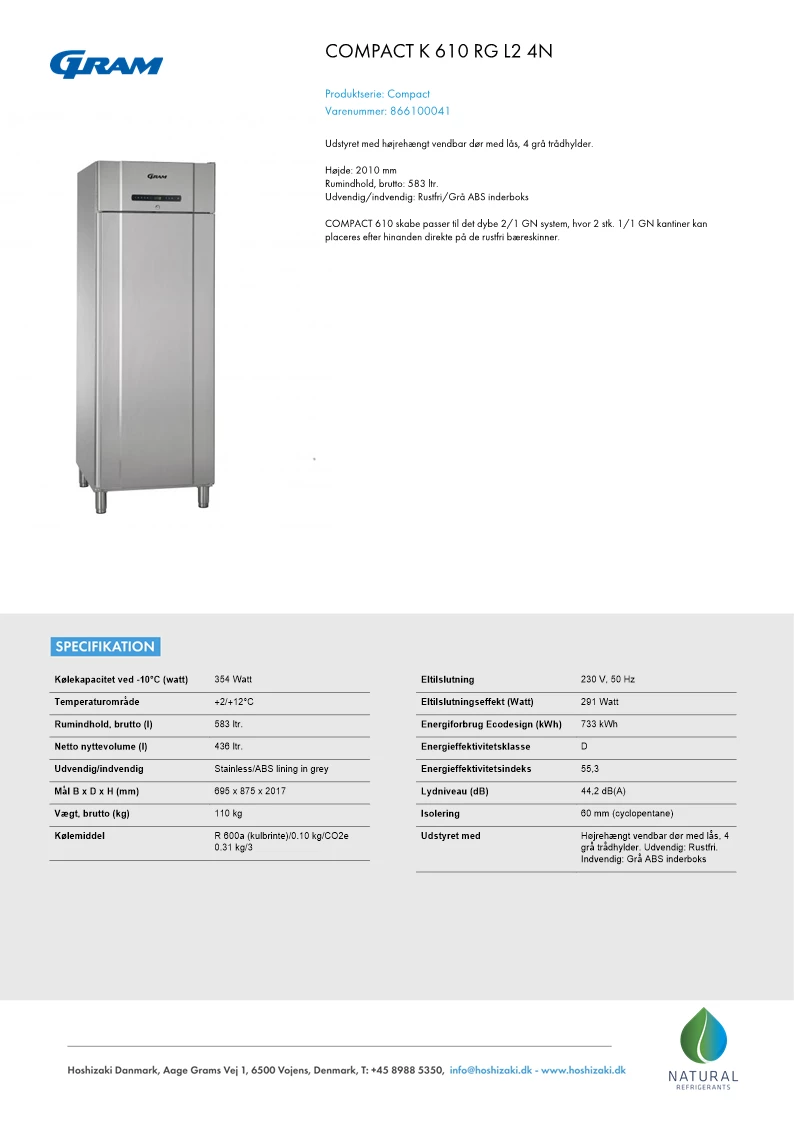 Rustfrit stål. Grå ABS inderboks. Højrehængt vendbar dør med lås. 4 grå flytbare trådhylder. Temperaturområde +2/+12°C. Bruttoindhold: 583 ltr. Mål: B 695 x D 868 x H 2010 mm. El: 230 Volt. 291 watt. Energiforbrug: 0,9 kWh/24h. Garanti: 3 år. Specifikationer: Energimærke: C