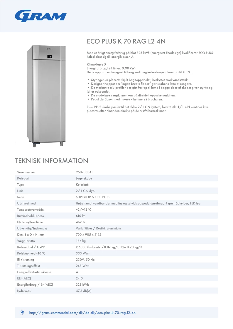 Superlavenergi - energitest EN441, ikrafttræden 1/1 2016. Vario silver/aluminium. Højrehængt vendbar dør. Fodpedal-døråbner. Lås. 4 plastbelagte trådhylder 2/1 GN. Temperaturområde: +2/+12. Bruttoindhold: 601 ltr. Mål: B 700 x D 905 x H 2125 mm. El: 230 Volt. 50 Hz., 248 Watt. Energiforbrug pr. år 328 kWh. Garanti: 5 år. Energimærke: A Specifikationer: Temperaturinterval: 2 - 12 grader Dørhængsling: Højre Antal hylder: 4 Vendbar dør Fodpedal Lys Dørlås Energimærke: A