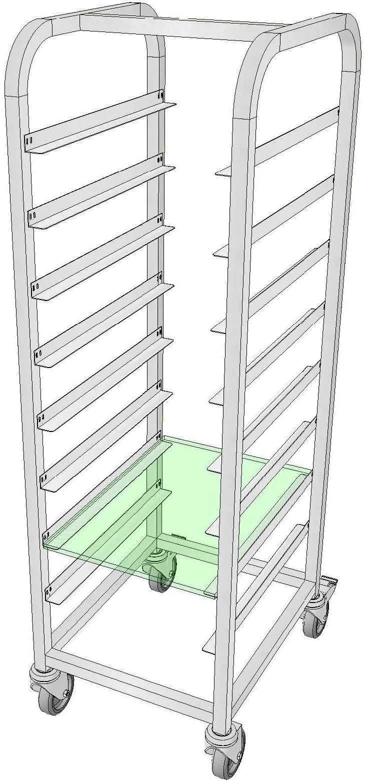 * helt i rustfrit stål. * glideskinner for 8 bakker. * stikafstand: 120 mm * hyldebærere i 25 x 30 x 480 mm * bakkestr.: 495 x 345 mm. Udv. mål eksl. hjul: B 406 x D 500 x H 1200 mm. Rustfri hjul Hjulstr.: 100 mm, 2 med bremse. **