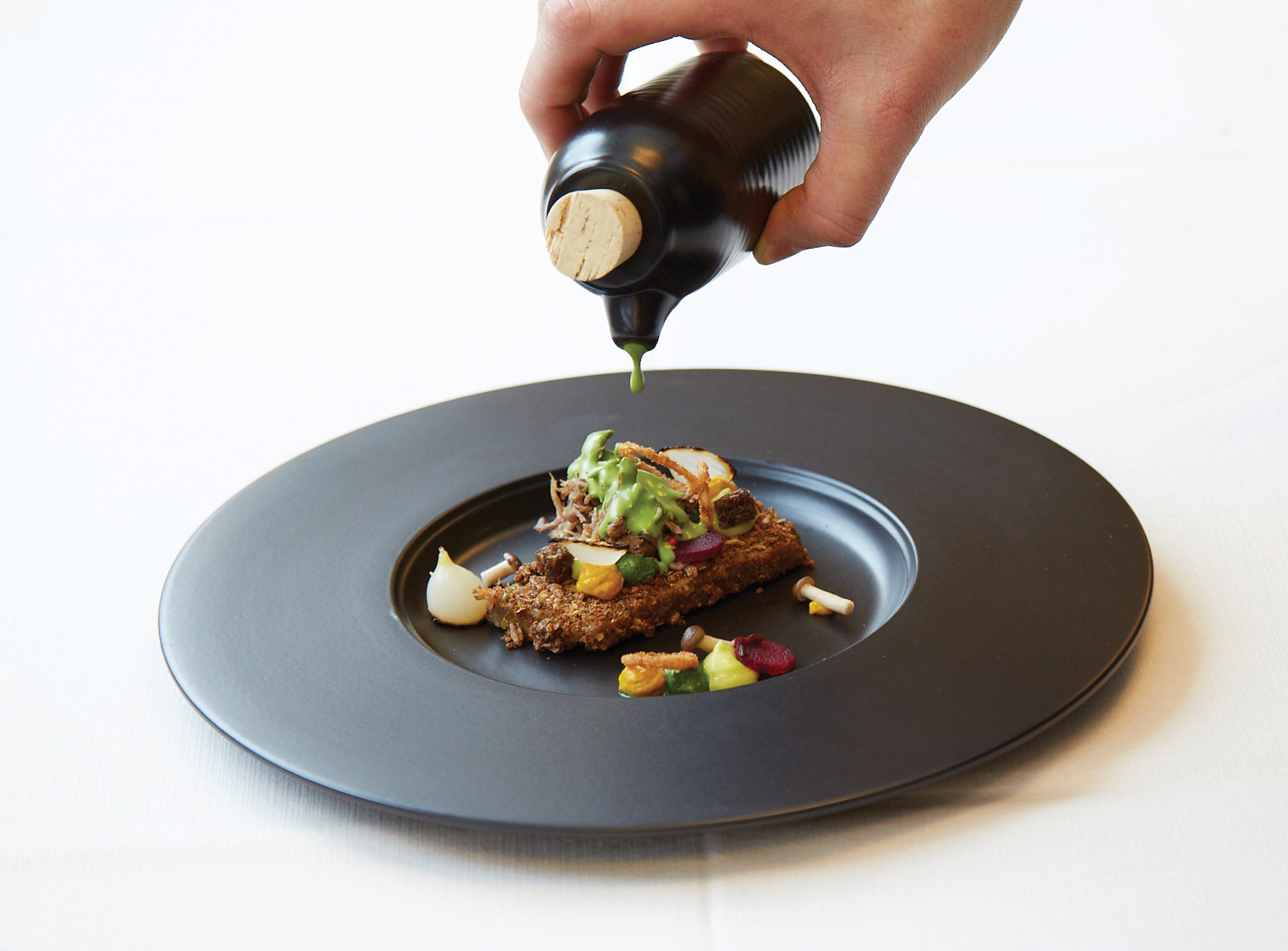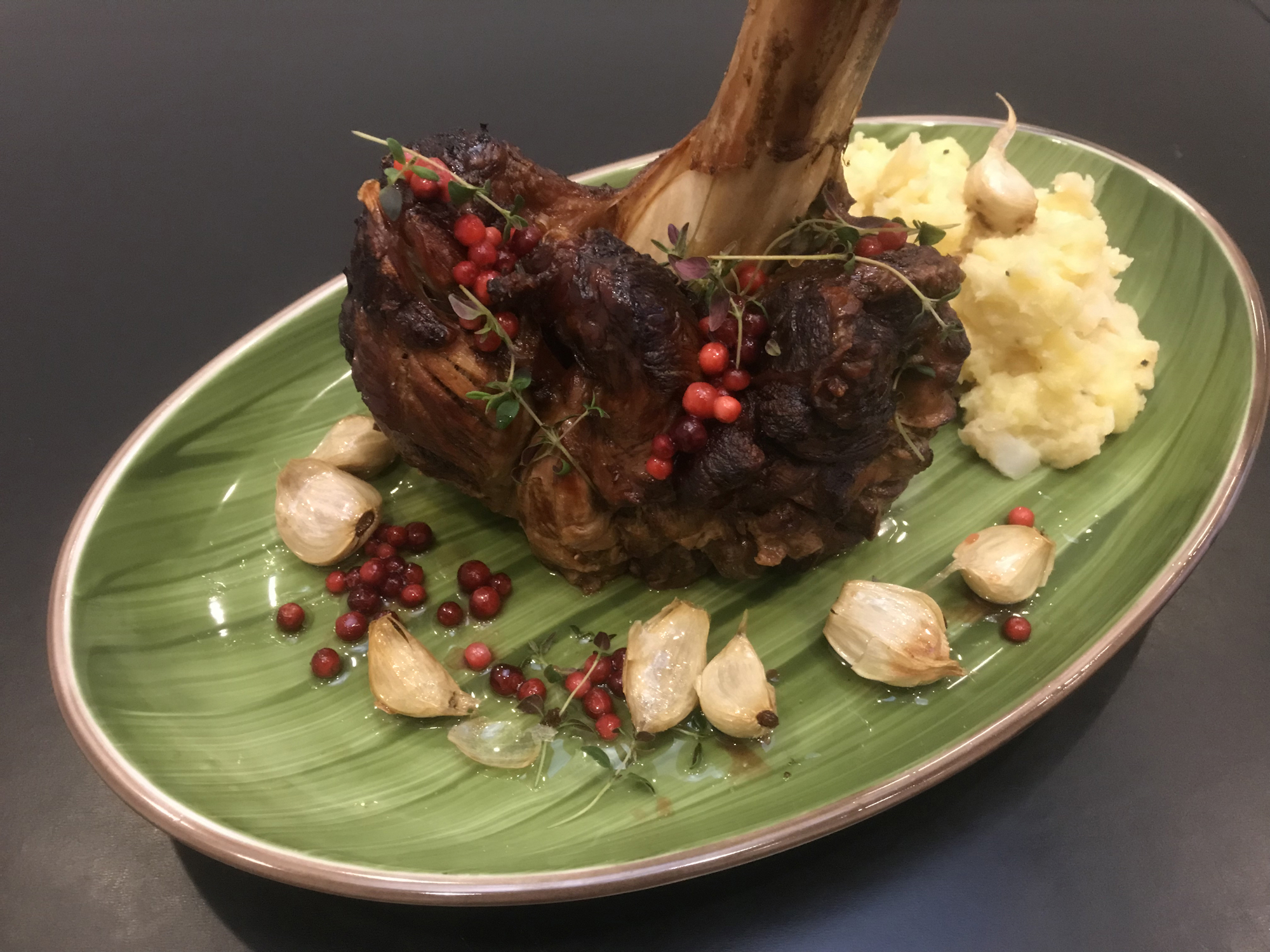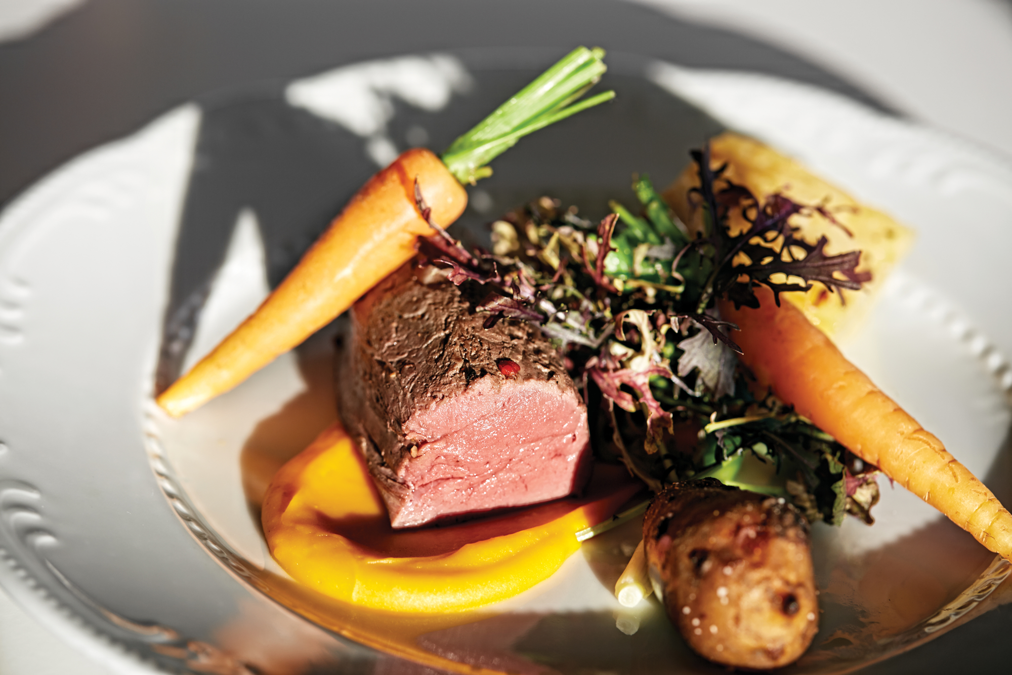 Serveret med selleripure med røget pibemarv, rødvin & balsamicopocherede rødbeder, bagte rødder med mandler, pommes fondant med rosmarin samt kraftig kalveglace.