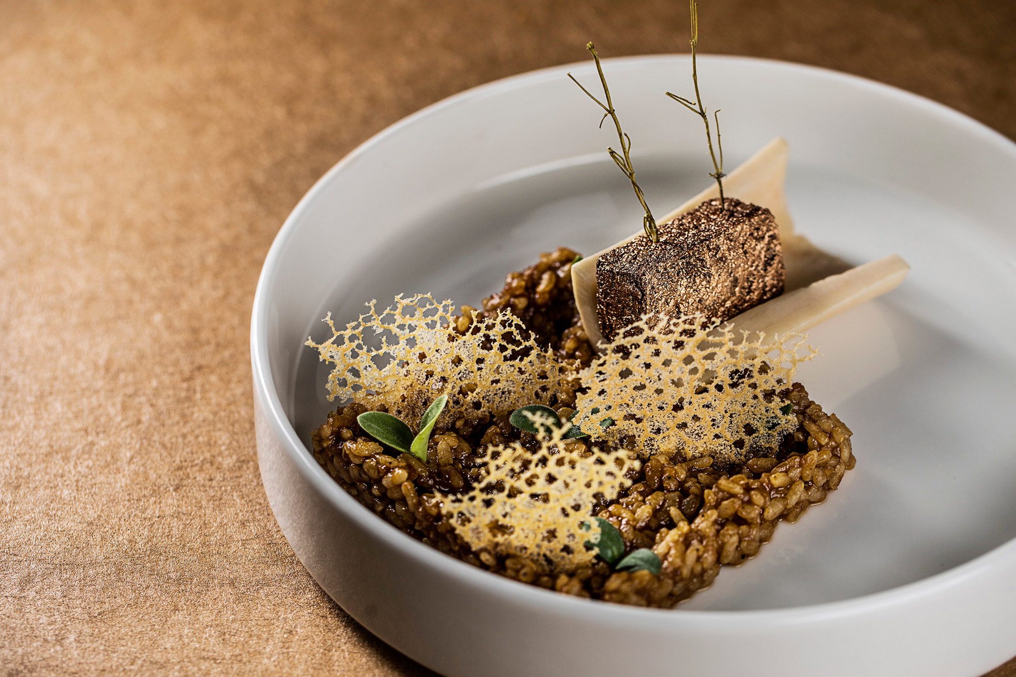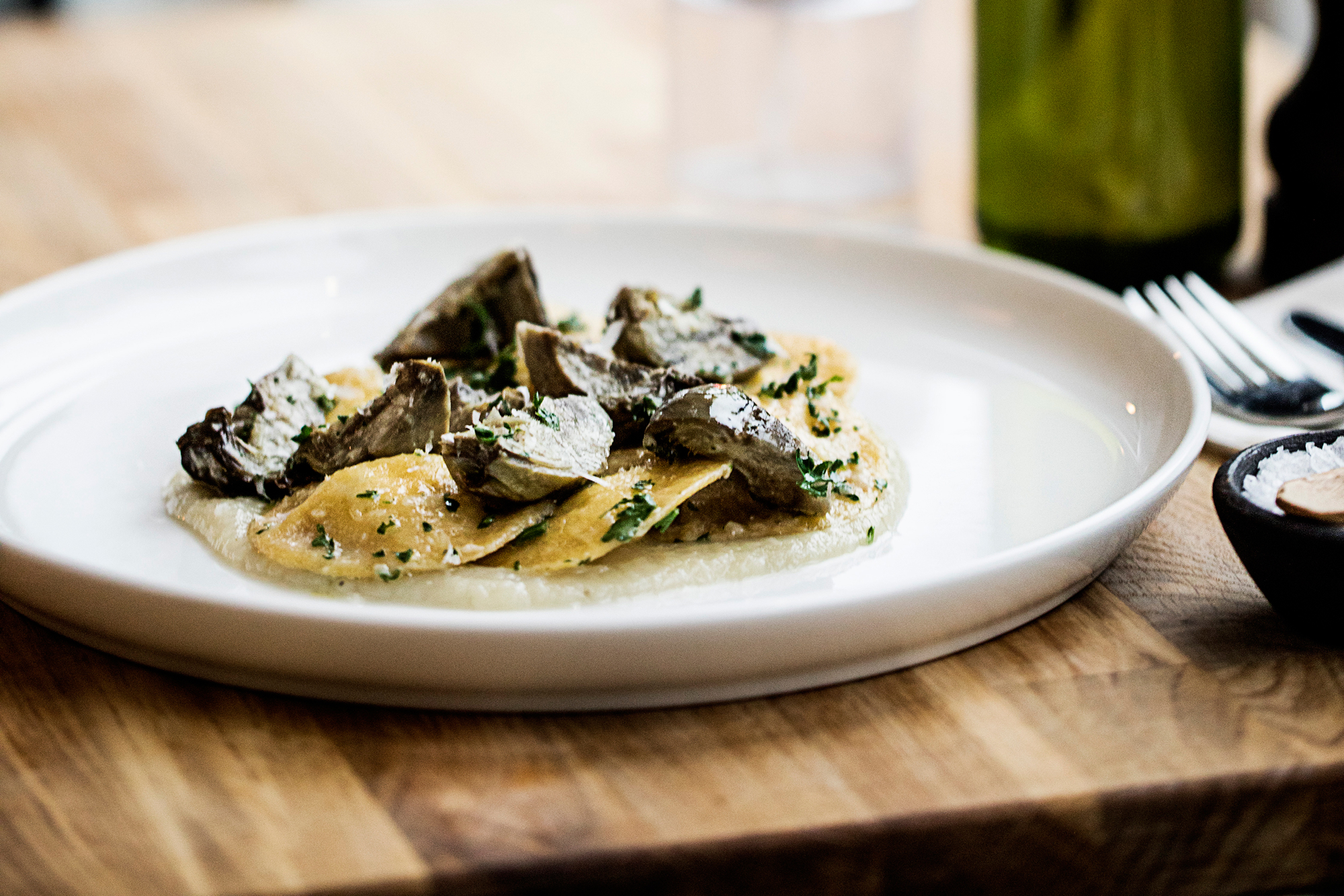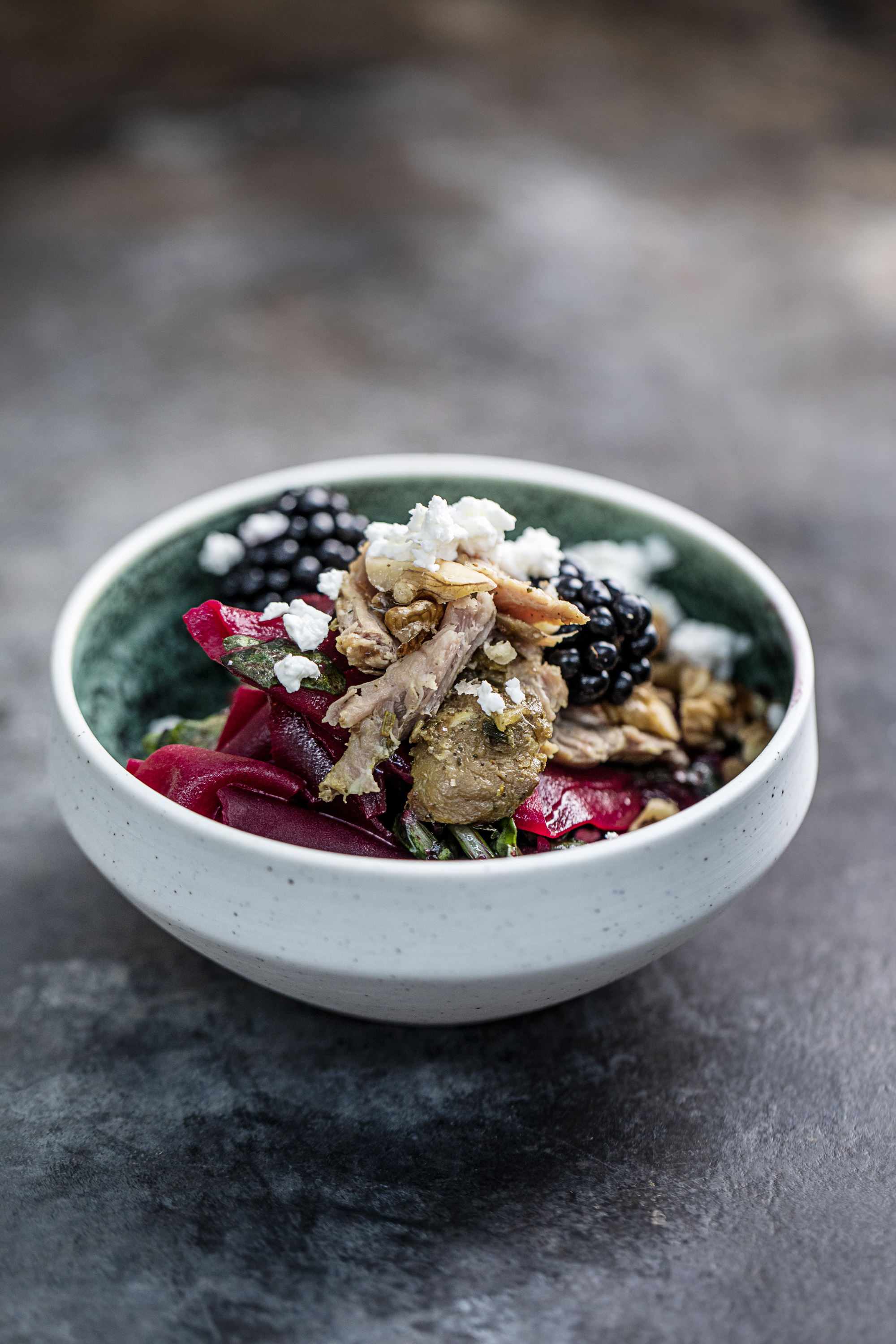 Serveret med selleripure med røget pibemarv, rødvin & balsamicopocherede rødbeder, bagte rødder med mandler, pommes fondant med rosmarin samt kraftig kalveglace.