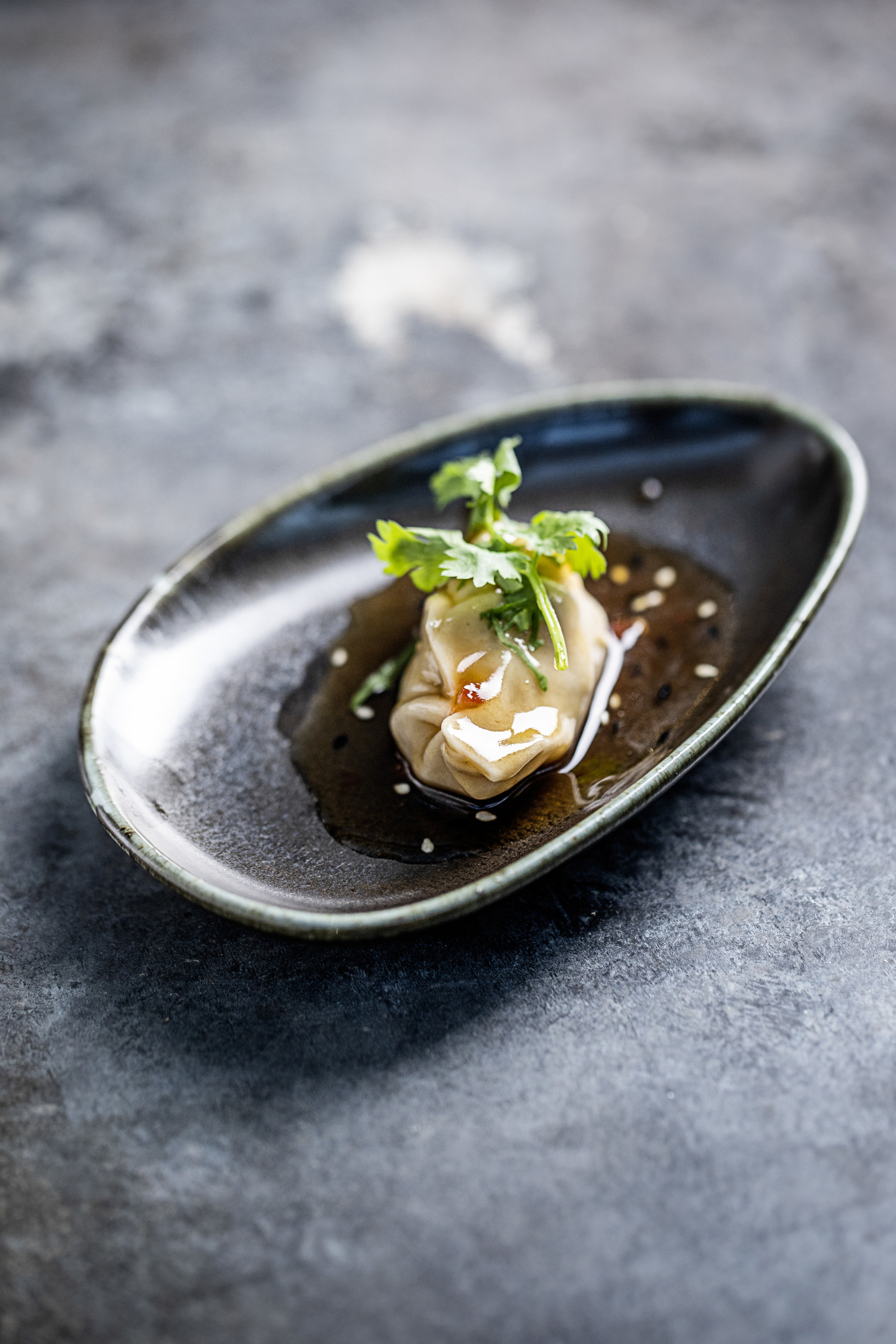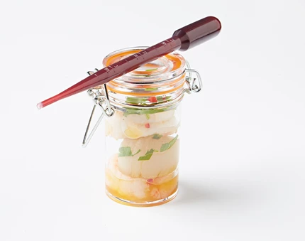 Orientalsk marineret skaldyrssalat med scampi & kammuslinger serveret med reduktion af teriyaki