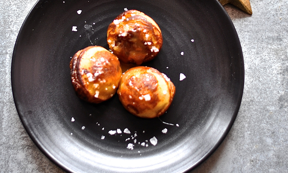 Saltkaramelæbleskiver med ekstra saltkaramel og flagesalt