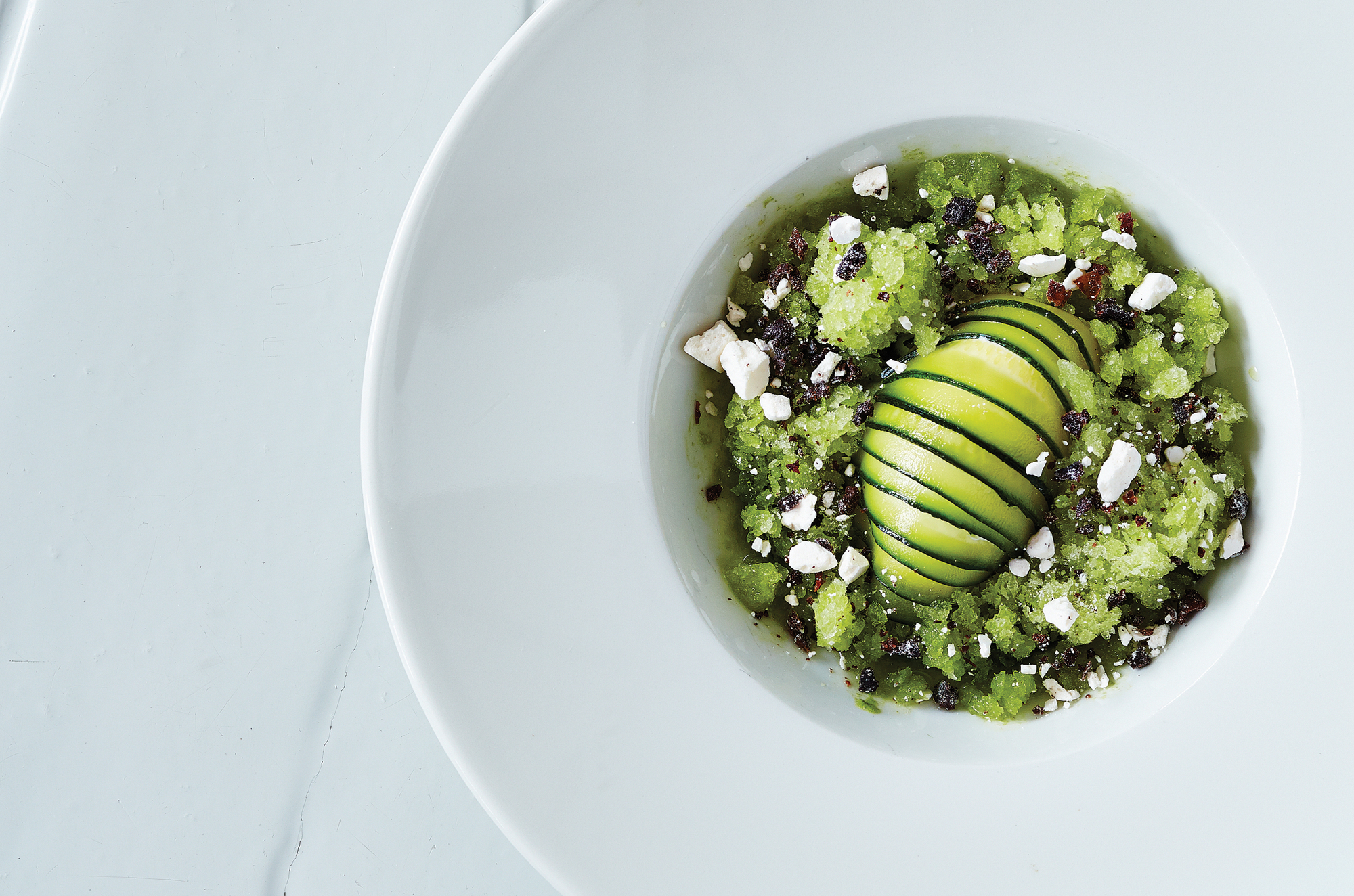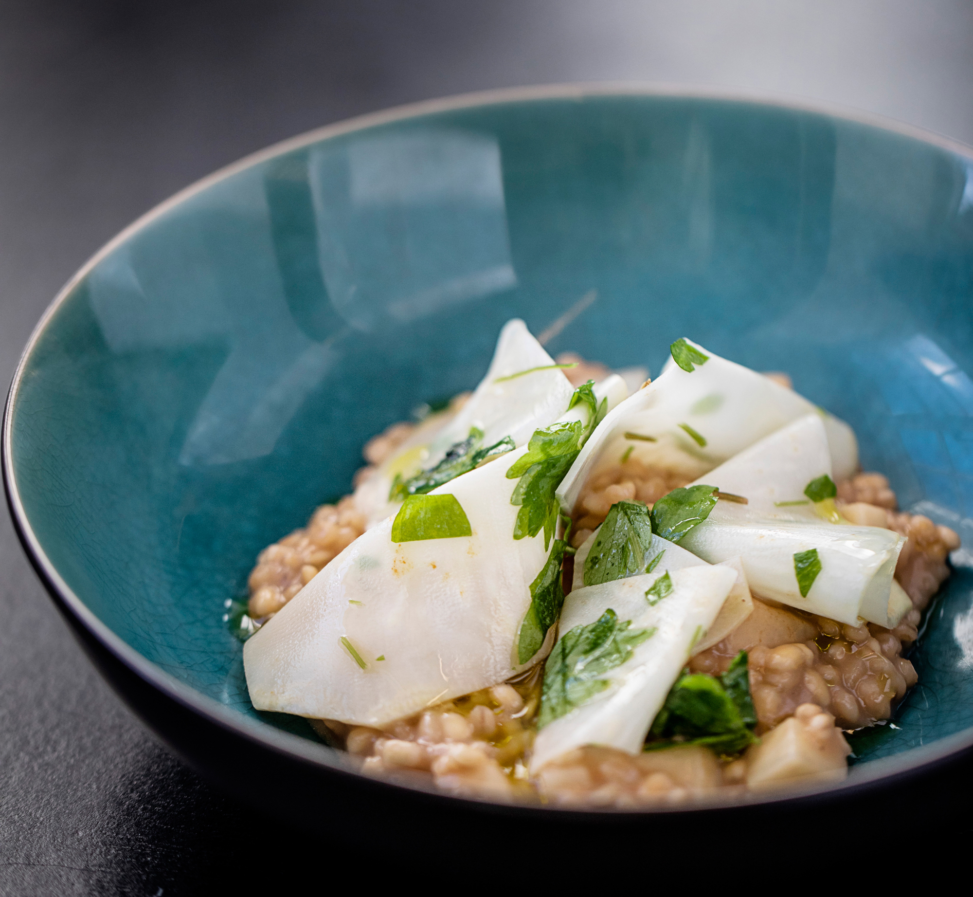 Kold fennikelsuppe med zambuca, anis, kørvel & urteolie.