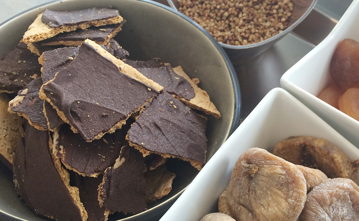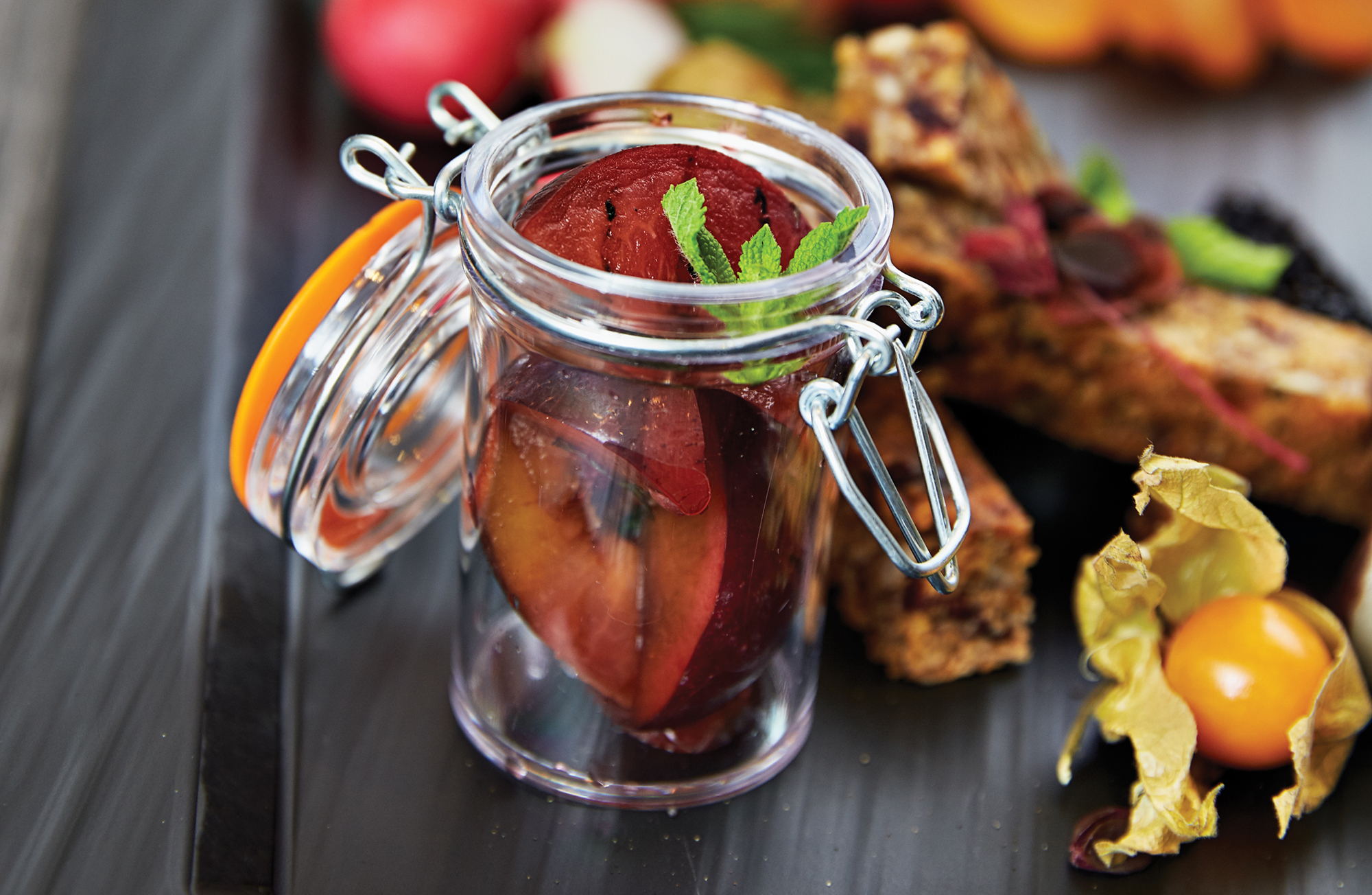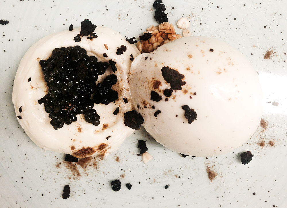 Kraftig chokolademousse med havtorn hertil solbær i madeira, kondenseret mælk og bærculis.