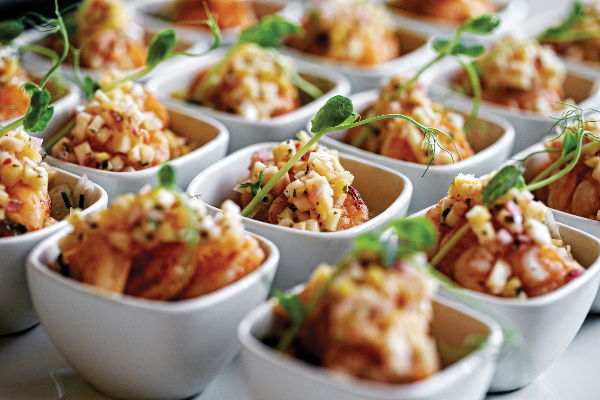 Kæmperejer med mango-mynte salsa på fennikelsalat med vilde ris