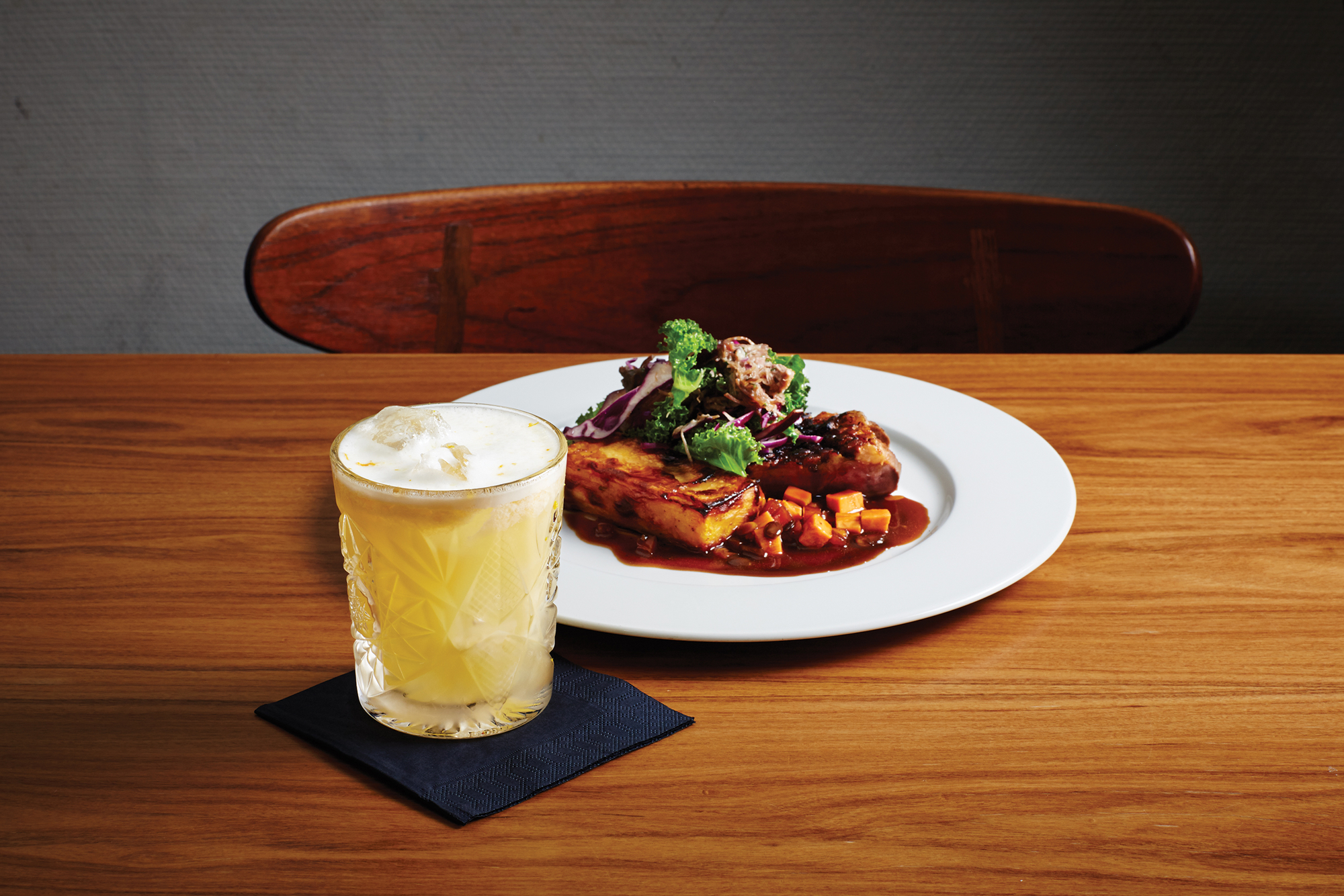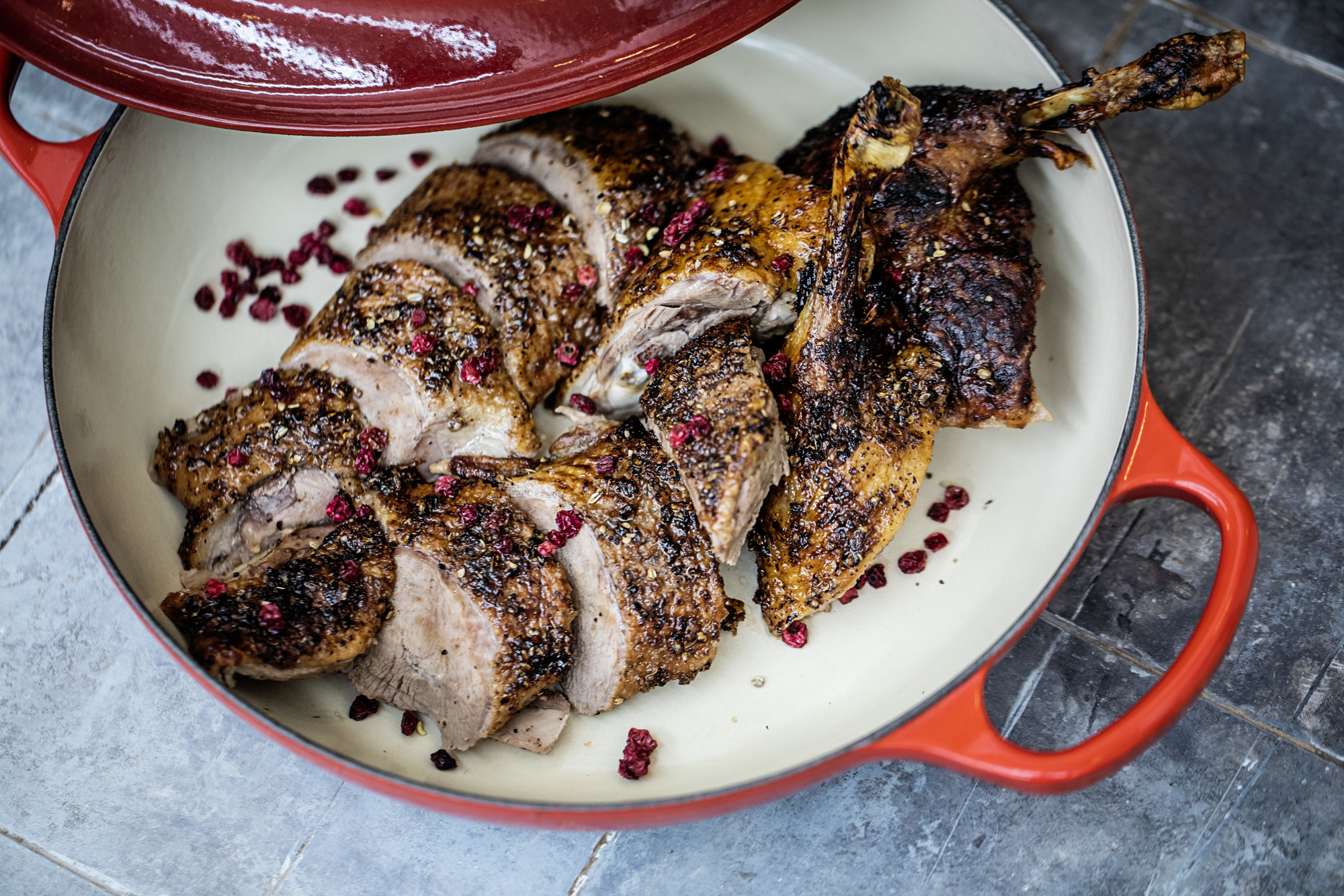 Stegt glaseret andebryst med græskar, chunky sauce og rødkål