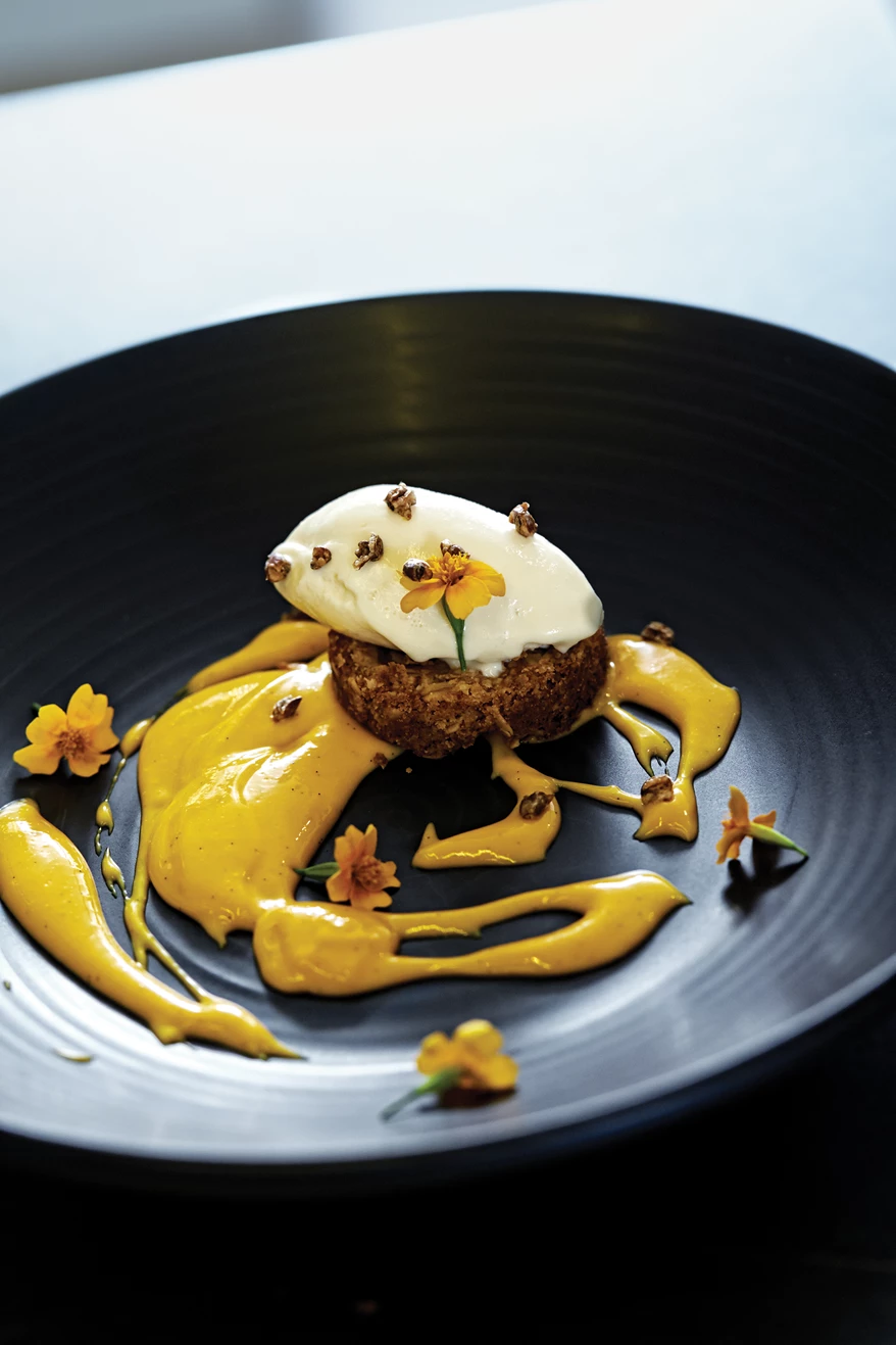 Krondyr med græskar-/gulerodpuré med bagte, marinerede jordskokker