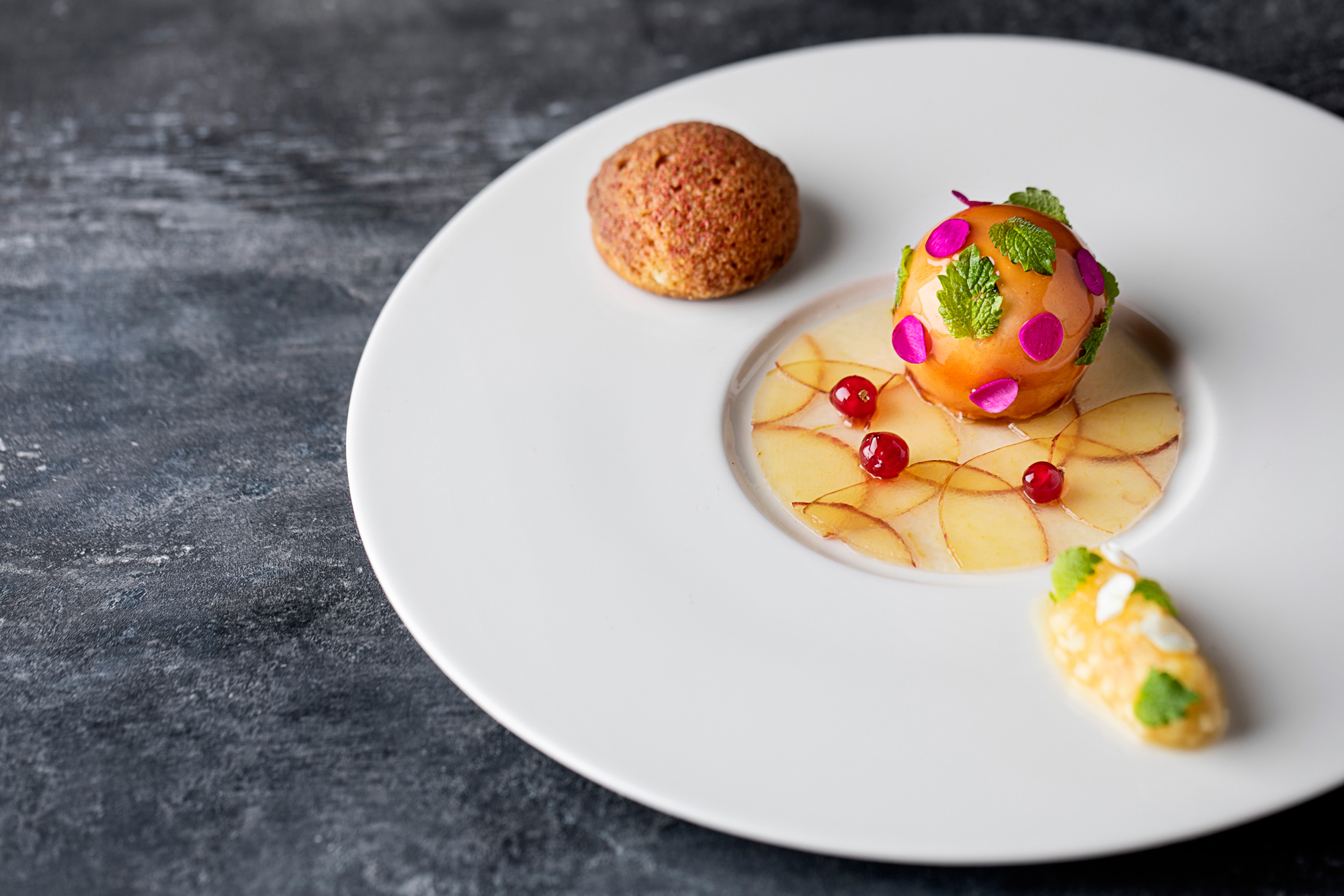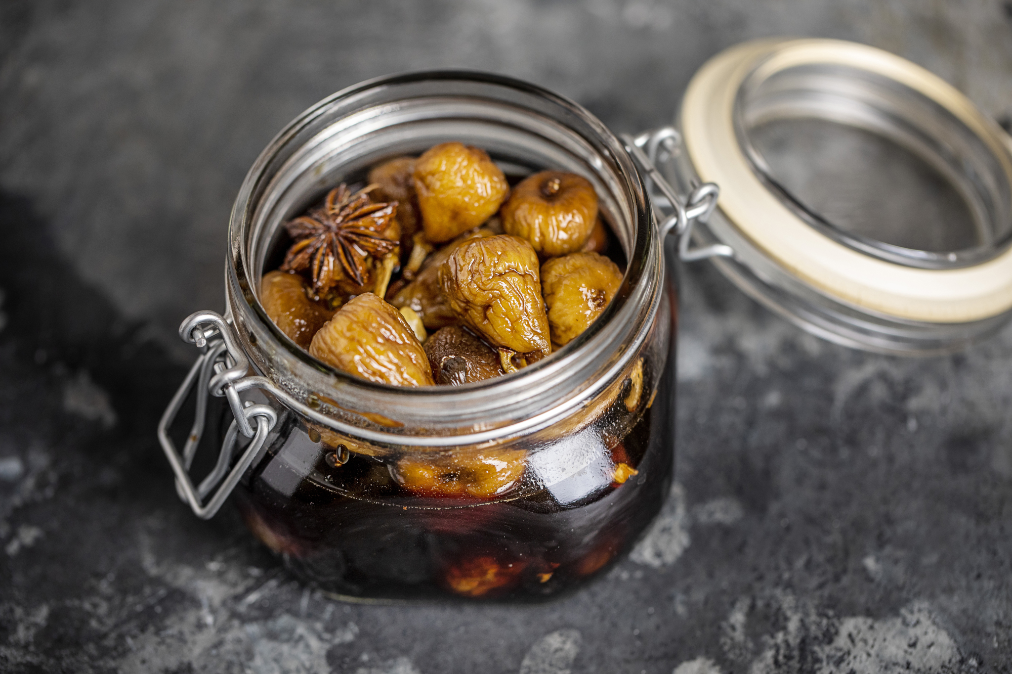 Figner i sherrysirup med spansk valdeon, reduktion af px sherry og appelsin samt pure af soltørrede abrikoser.