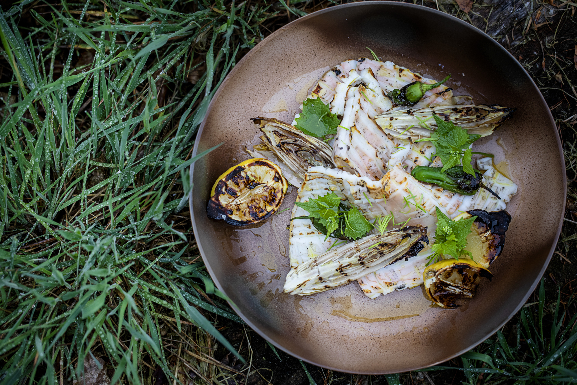For kammeraten og kollegaen Dennis, kok og inspirationskonsulent hos BENT BRANDT, er den sirlige gastronomi sat på hold, mens den udtænkte bålmenu udvikler sig i takt med fundet af vilde urter og friske granskud på restaurantens 30 tdl. store område.