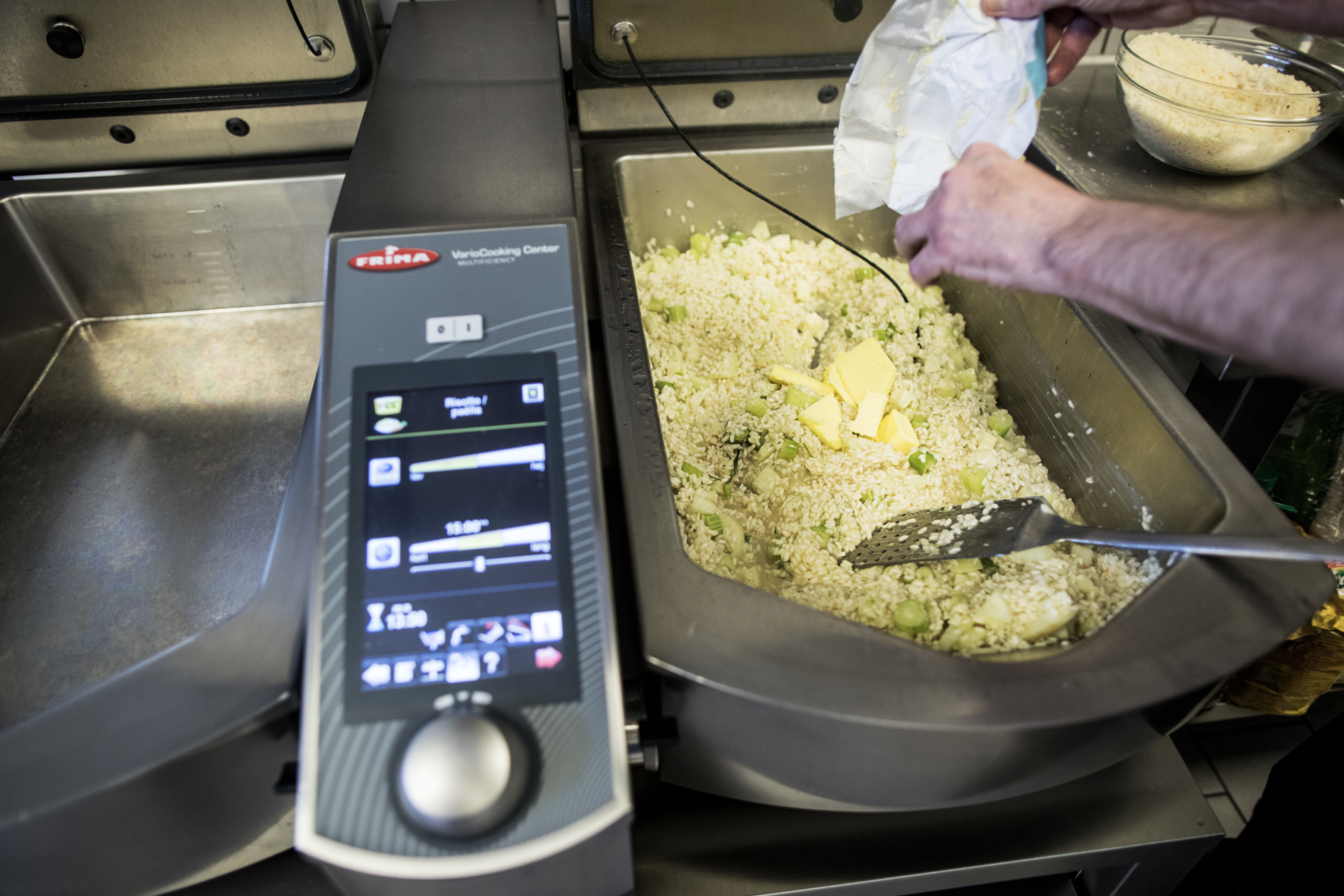 Mens vi taler, laver Søren den risotto, der sammen med stegte kyllinger udgør dagens lune ret. "En halv time i FRIMA'en – så er risottoen klar. I gryder ville det tage timer. Vi producerer typisk 4-6 forskellige ting om dagen i FRIMA'en, intet brænder på og rengøringen er lynhurtig," konstaterer køkkenpædagogen, der også er begejstret for mulighederne med sous vide-tilberedning. "Vi får fremragende smag ud af billigere udskæringer, når vi tilbereder over nat. For ikke at tale om smagen i den confiterede and…"