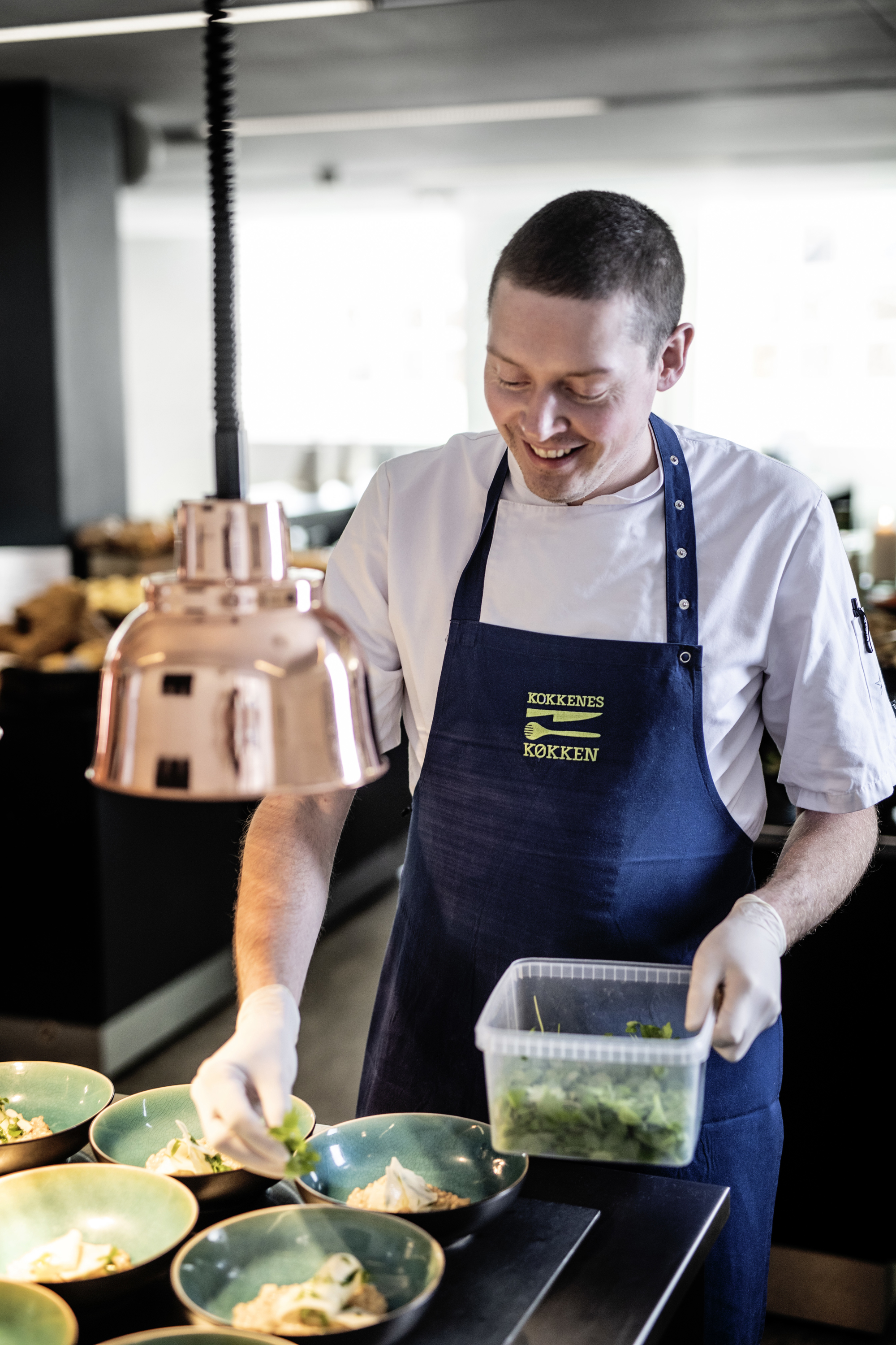 "Vi bruger alt, så vi undgår madspild, og vi kan servere kød, fordi det kun kræver 10-14 kilo, når vi portionsanretter. Og der er fremragende soyaprodukter, der både kan tilføre smagen af svampe og give struktur i en kødsovs. Vi fermenterer og eksperimenterer, så vi også kan opfylde specielle ønsker – som f.eks. når en af husets bornholmskfødte medarbejdere foreslår Gudhjems Dyppe til den næste omgang kogt torsk," fortæller køkkenchefen, som også er stolt af sin økologiprocent, der er på godt og vel sølvniveau.