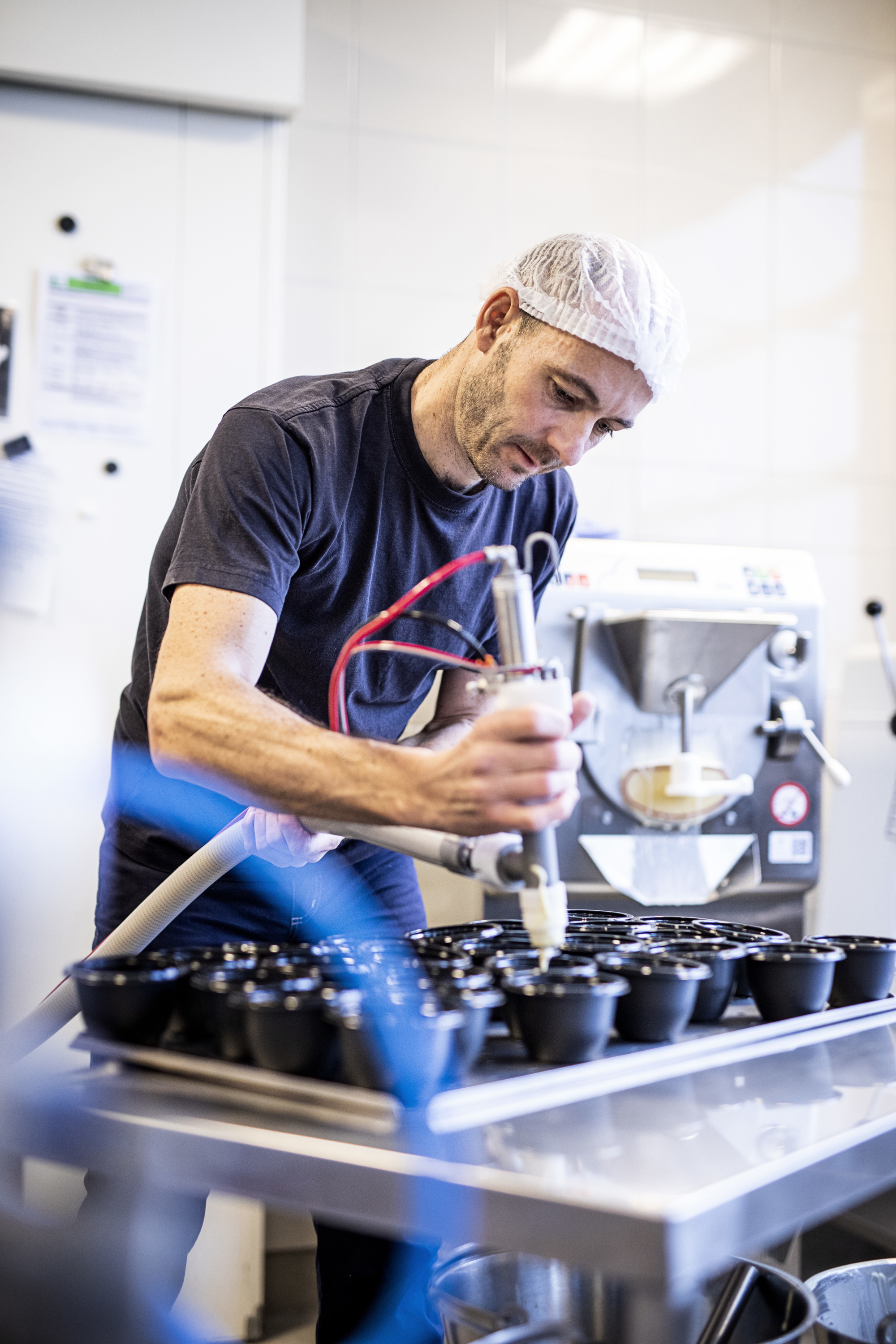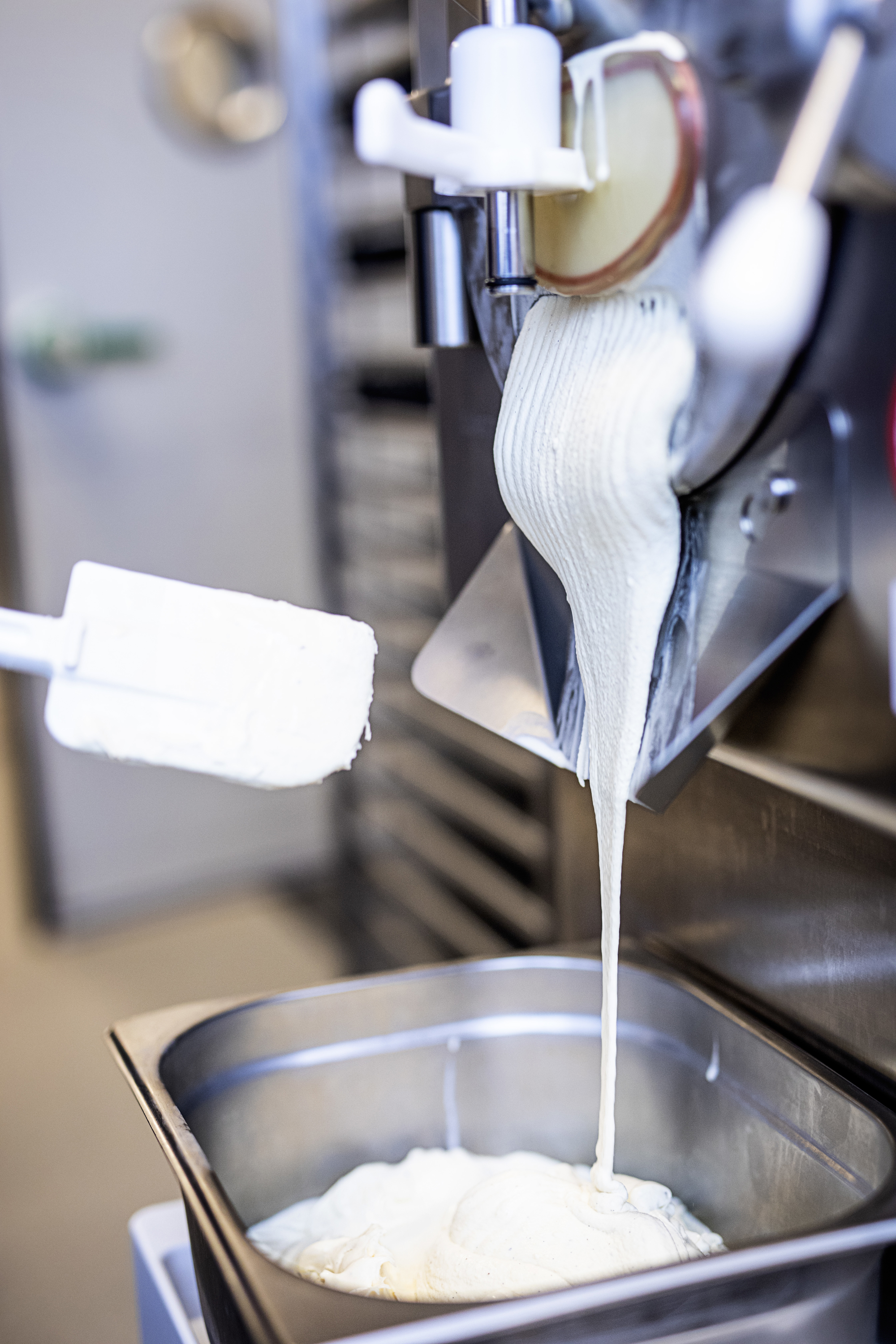 Det ser også nemt ud. Michel hælder ismassen i maskinen, den ønskede istype og konsistens vælges på displayet. Processen startes, og en sindrig konstrueret spartel sørger for at holde ismassen i bevægelse. Imens kan Michel følge konsistensen som en talværdi på maskinens display. Han kunne vælge at overlade processen til et af de automatiske programmer, men da han stadig eksperimenterer, holder han på 'kokkemanér' selv øje med konsistensen. Det tager 8-9 minutter – så er de op til 7,5 kg is klar til at fylde i GN-kantiner.