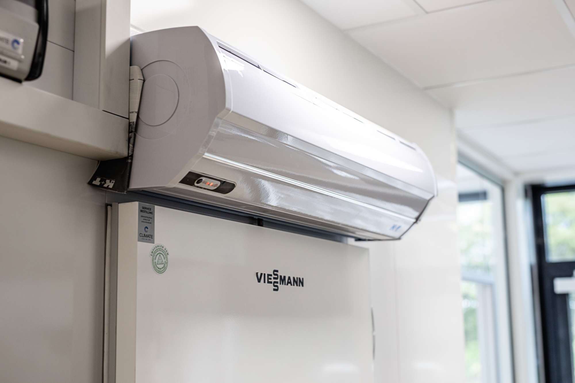 1 til køl og 1 til frost. Kølerummet befinder sig lige over for Rational-maskinerne under det gennemgående emfang. For at forhindre, at emfanget suger kulden ud af kølerummet, når døren åbnes, er der monteret en blæser, som skaber et lufttæppe foran døren. Det giver store energibesparelser.