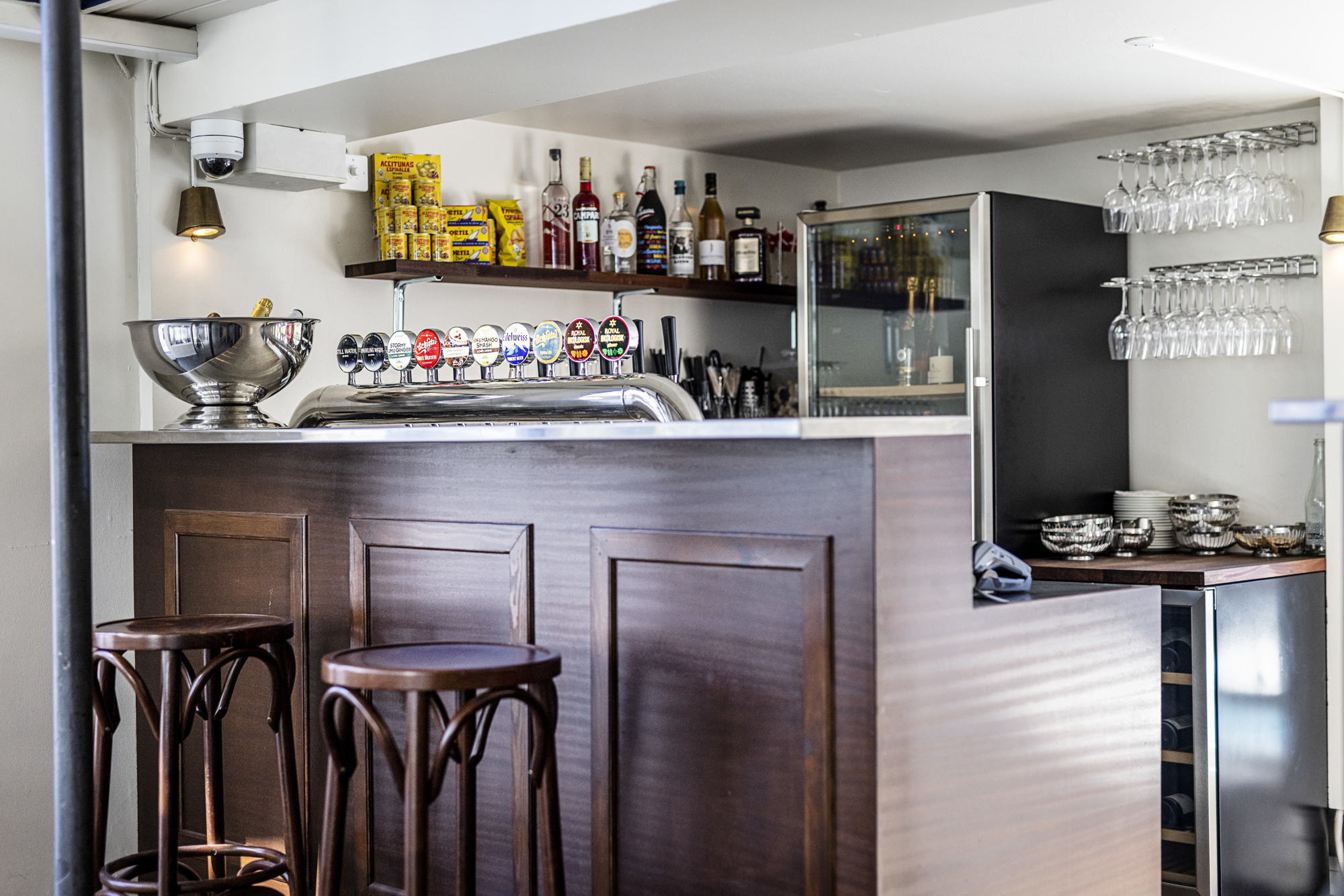 Alt er indrettet med gennemtænkte detaljer fra starten. ”Jeg har arbejdet i mange barer, og jeg ved, hvor vigtig det er, at disken er indrettet, så man skal bevæge sig så lidt som muligt,” fortæller Søren Jessen. ”I den populære verandabar tilgodeser indretningen, at 2 medarbejdere på få kvadratmetre kan ha’ forrygende travlt, selv om der er meget lidt plads mellem frontdisk og backbar. Og i restaurantens største bar kan tjenerne hente vin uden at gå i vejen for medarbejderne bag disken. Det fungerer…!”