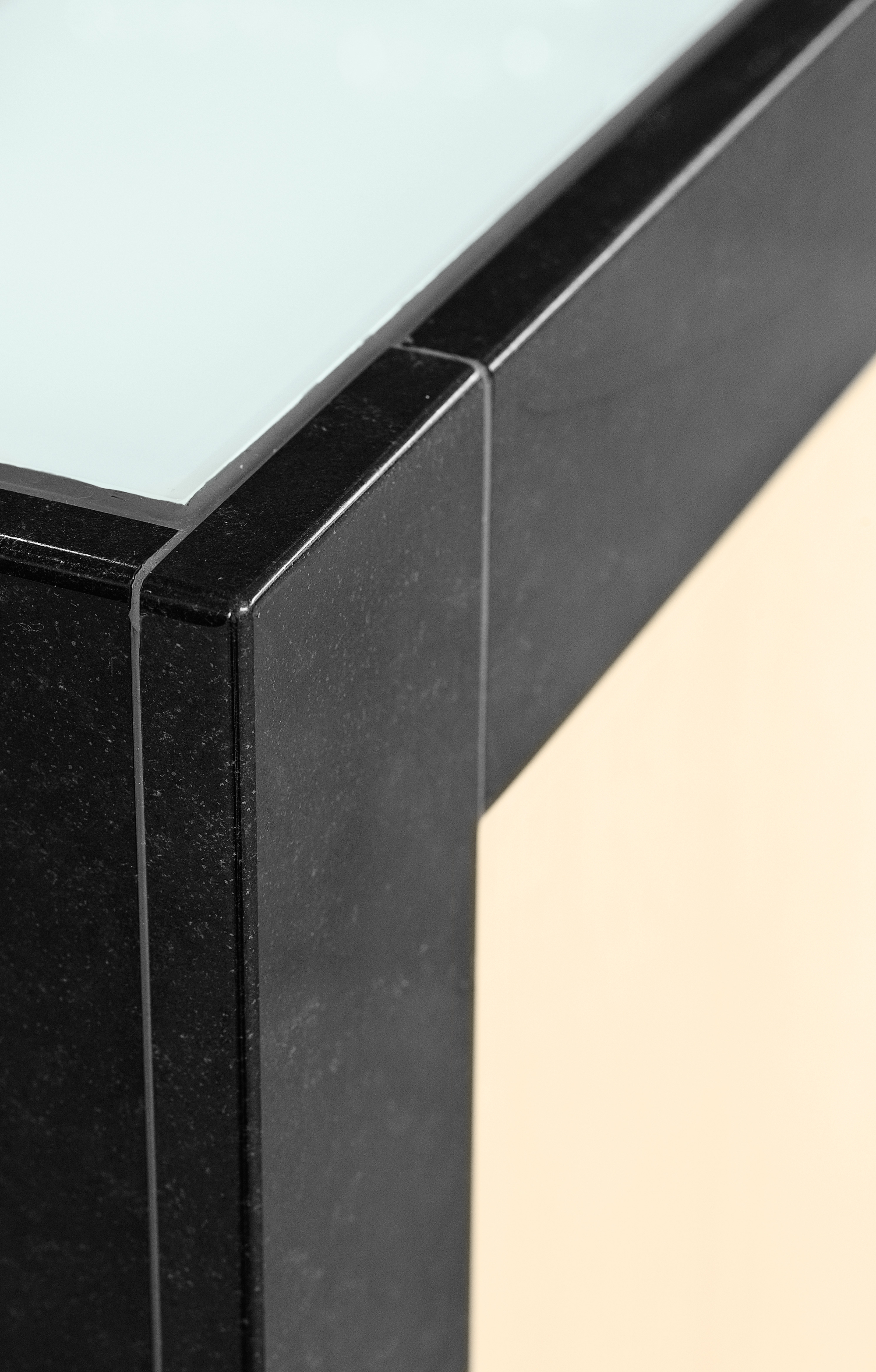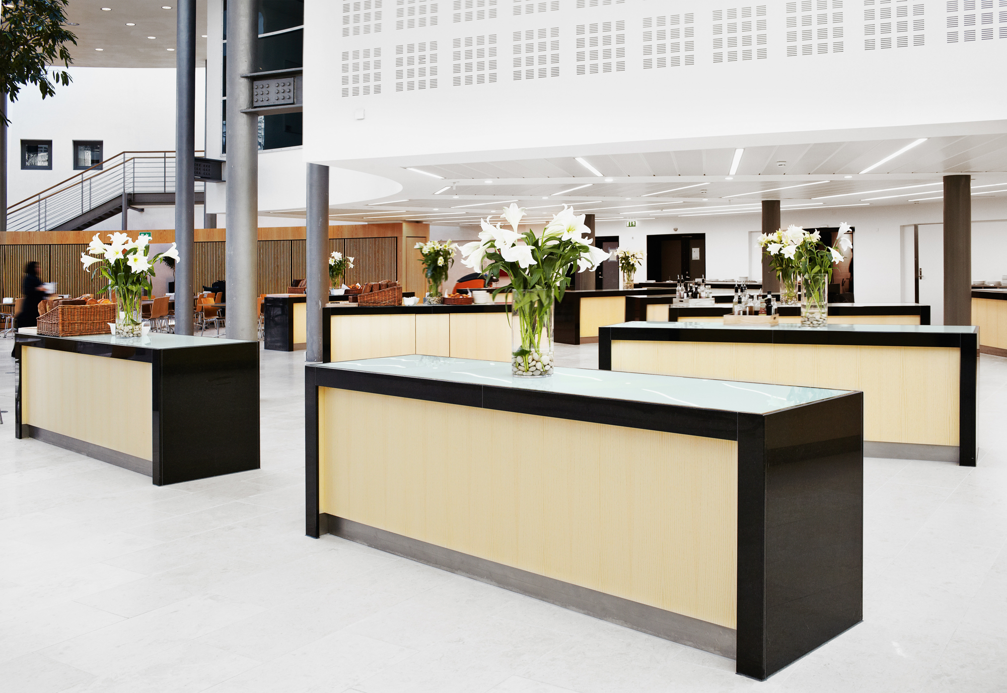 Kantinen er opbygget omkring buffeter/diske fremstillet i granit, glas, finer og rustfrit stål.