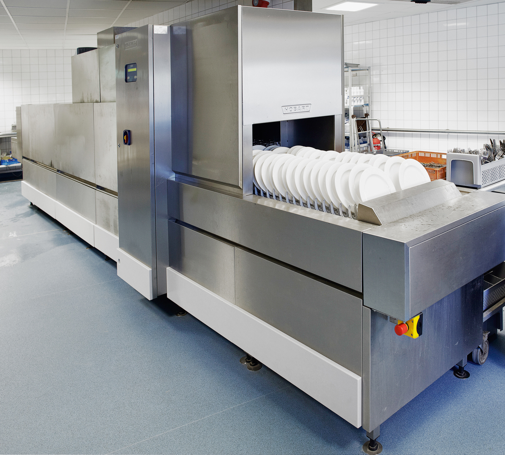 I det separate opvaskerum opfylder en stor tunnelopvaskemaskine med fingerbånd de store krav til kapacitet.