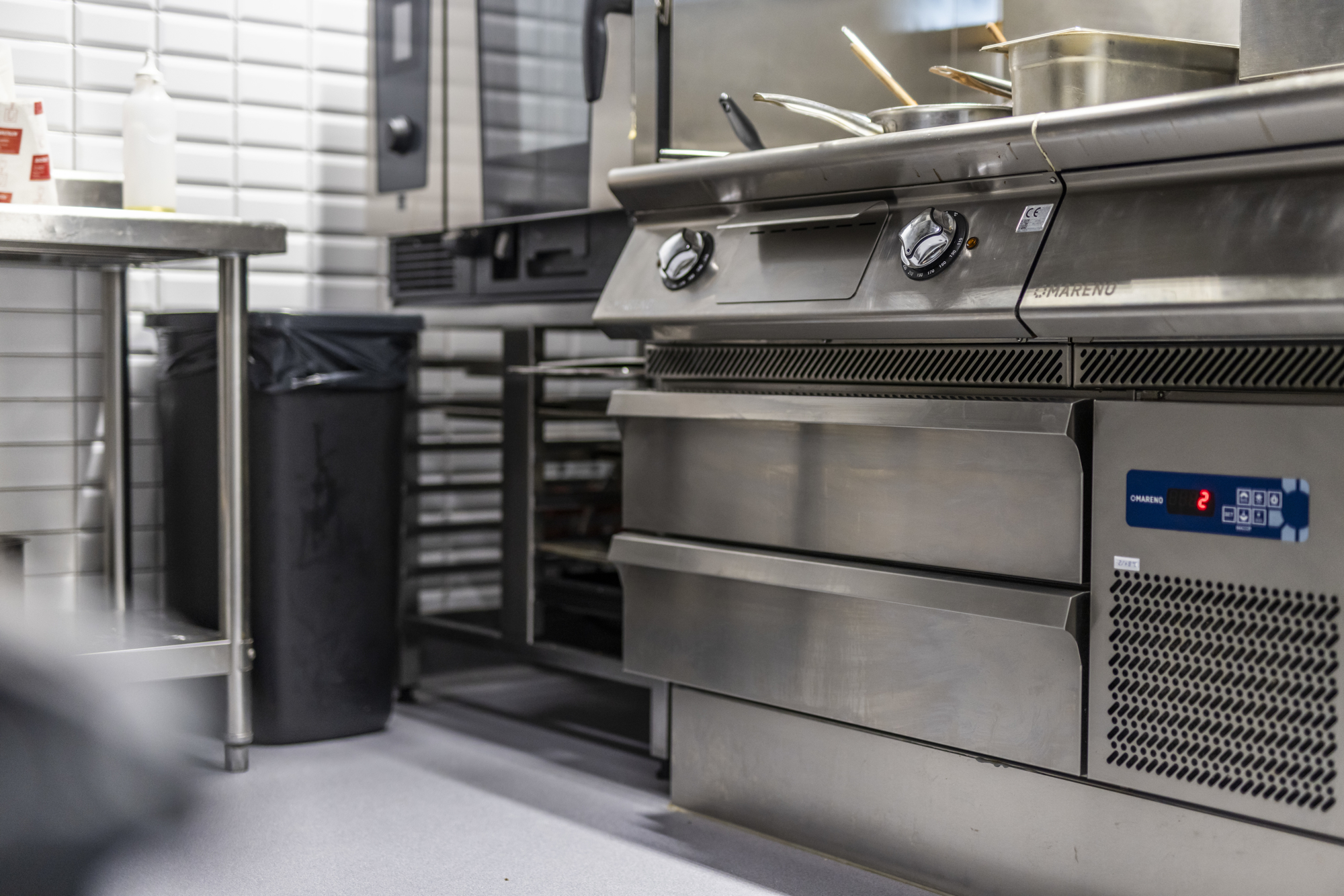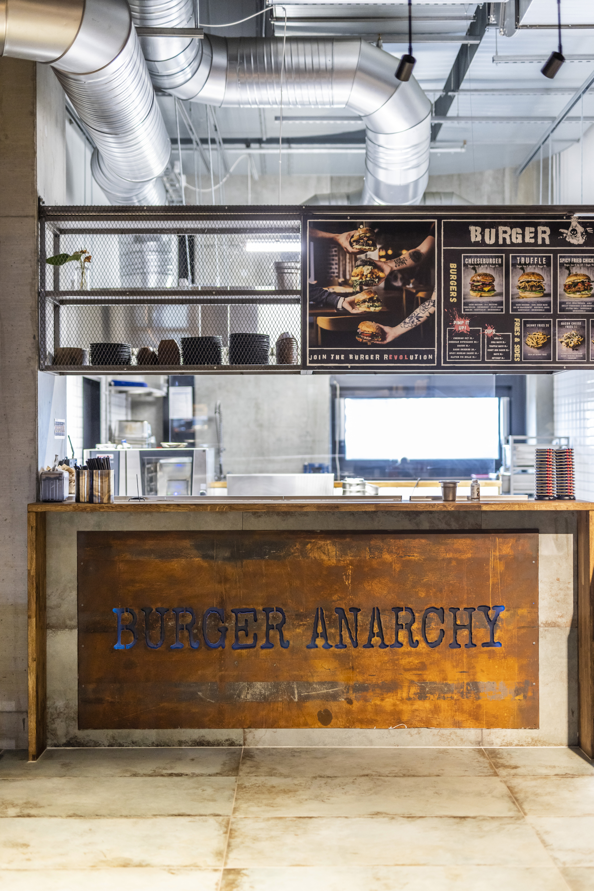 BURGER ANARCHY Køkkenplanlægning med RATIONAL ovn og MARENO kølebord med udtræksskuffer og stegeplade oven på. MARENO friture i forlængelse heraf.