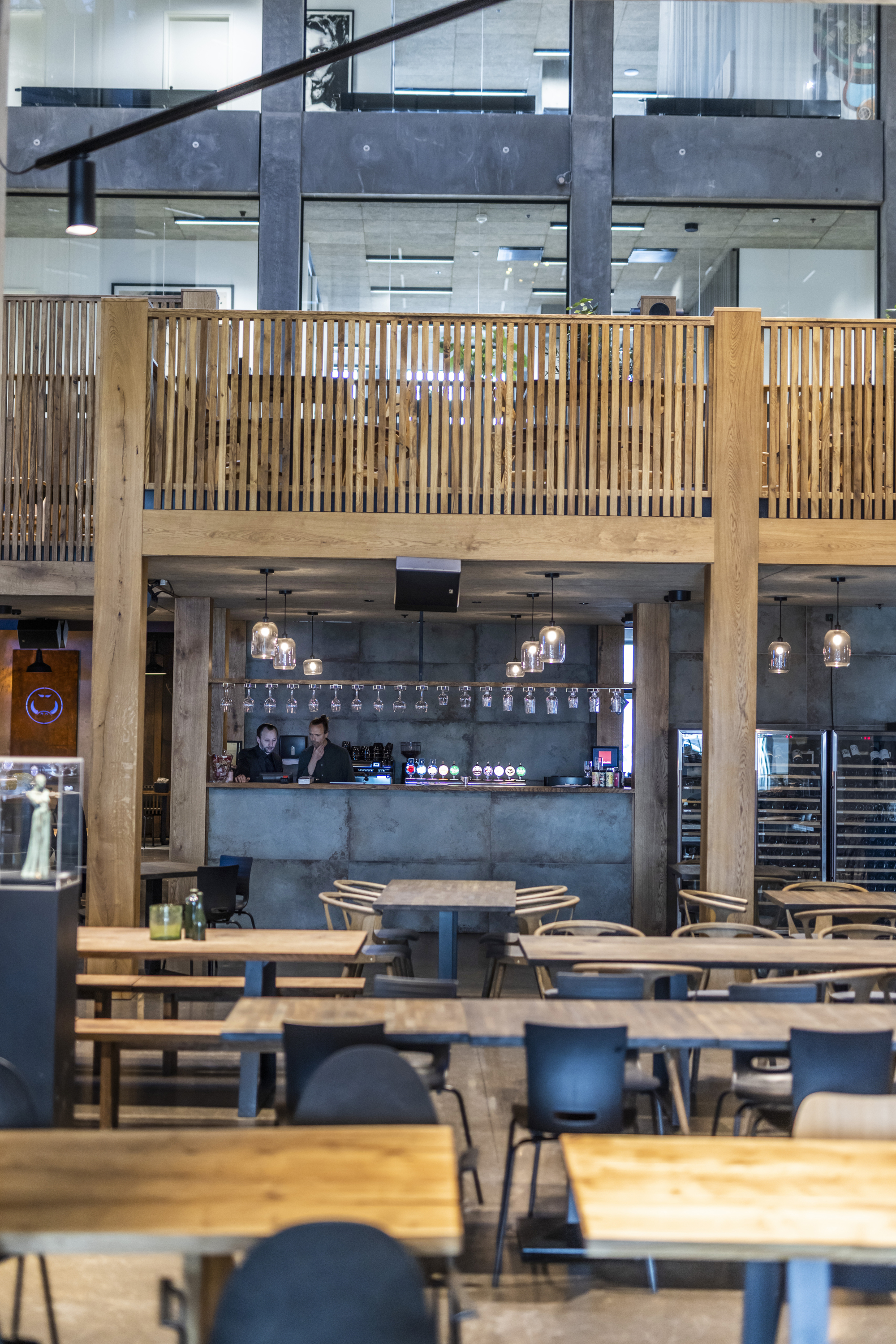 Markedshallen i stueetagen løfter sig i midten af bygningen til et trekantet, tre etager højt rum, som bygningens kontorlejemål indvendig har udsigt til gennem vinduer fra gulv til loft. Komfortable siddepladser ved langborde, i små nicher og loungeområder suppleres af et spiseområde på søjler, der også kan lejes til små selskaber og møder.