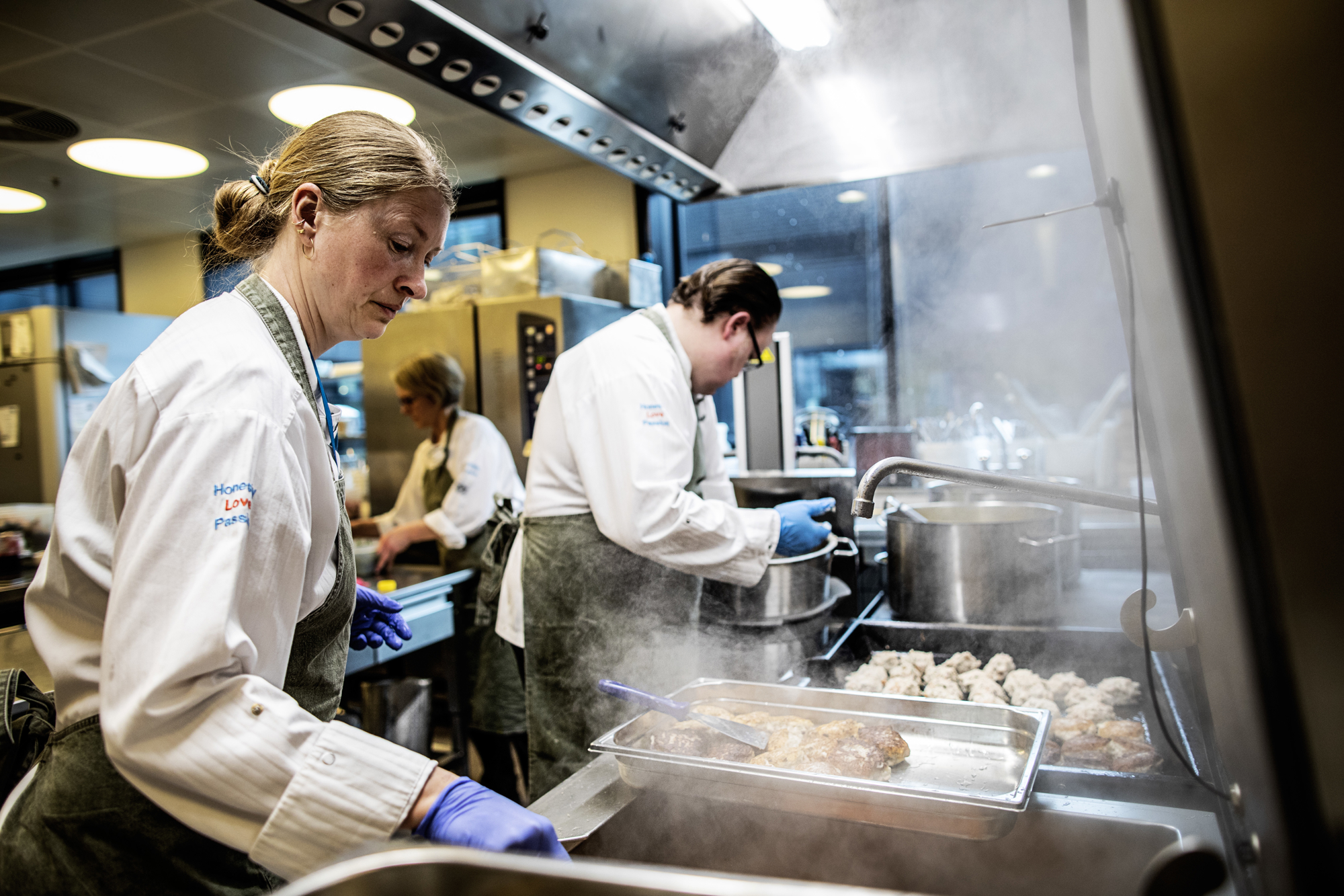 "Der er fisk på menuen hver dag, og der spises faktisk mere fisk end kød her i huset," fortæller køkkenchefen, der gerne tager tørnen ved Yakitori-grillen, når de 1.200 laksespyd skal grilles. Det samme gør hans kolleger, der næsten dagligt har en synlig rolle i kantinen – når kødet skal skæres ud eller racletten skal betjenes som en del af alpetemaet.