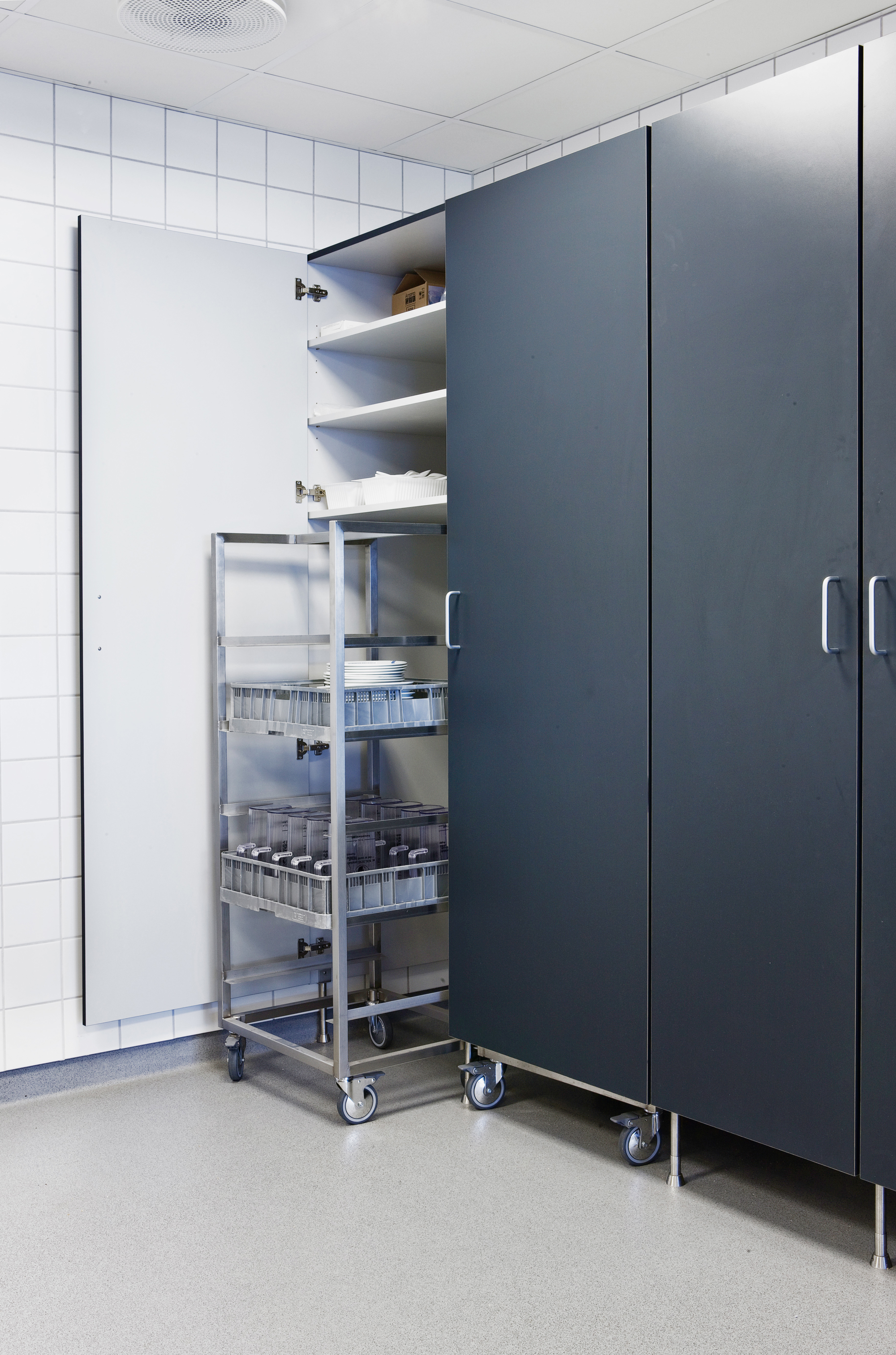 Skabene i køkkenet er indrettet til indkøring af stikvogne, som gør at pladsen udnyttes optimalt.