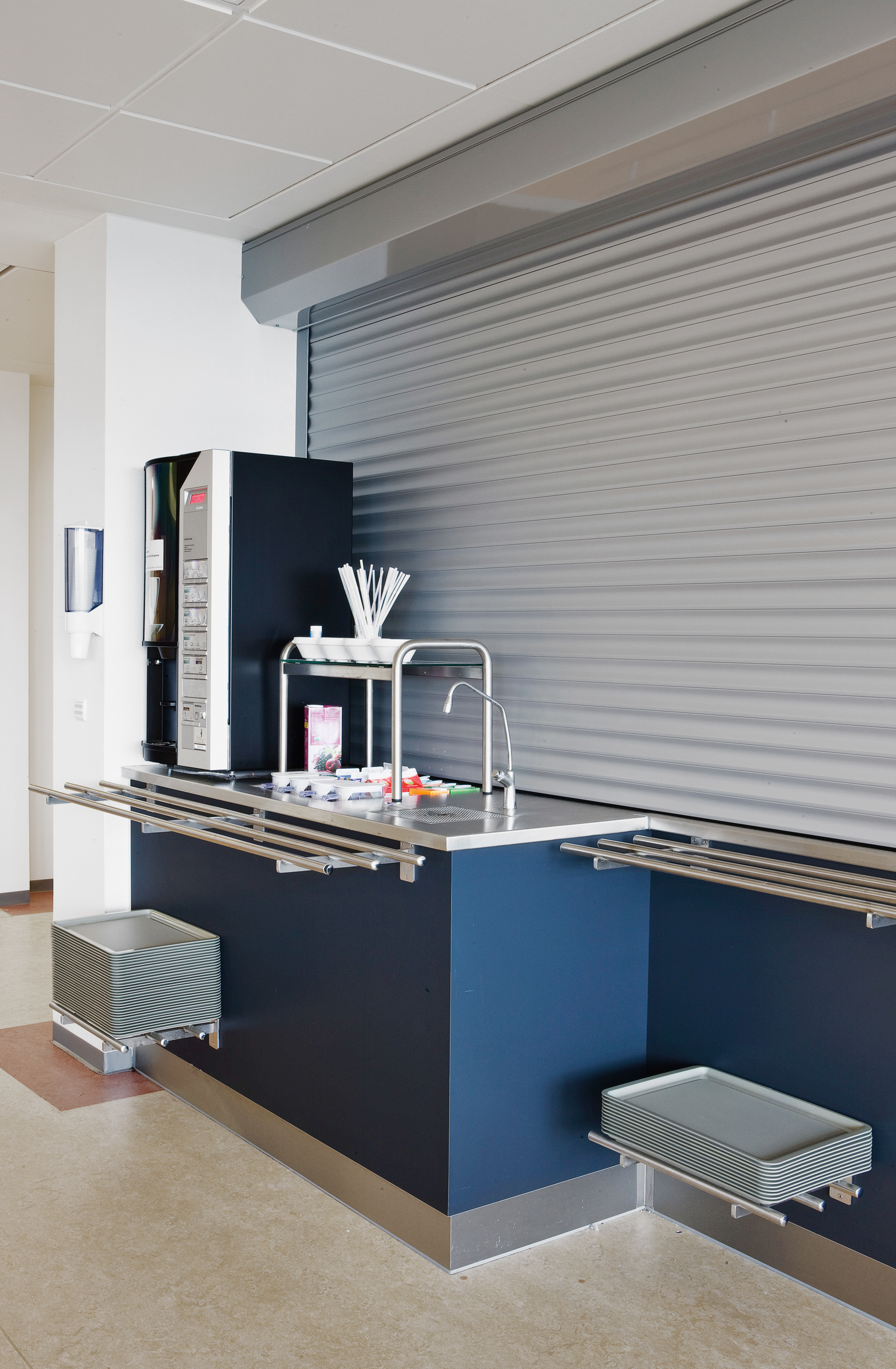 Køkkenet kan aflukkes med rullejalousi, der lader drikkestationen stå fremme.