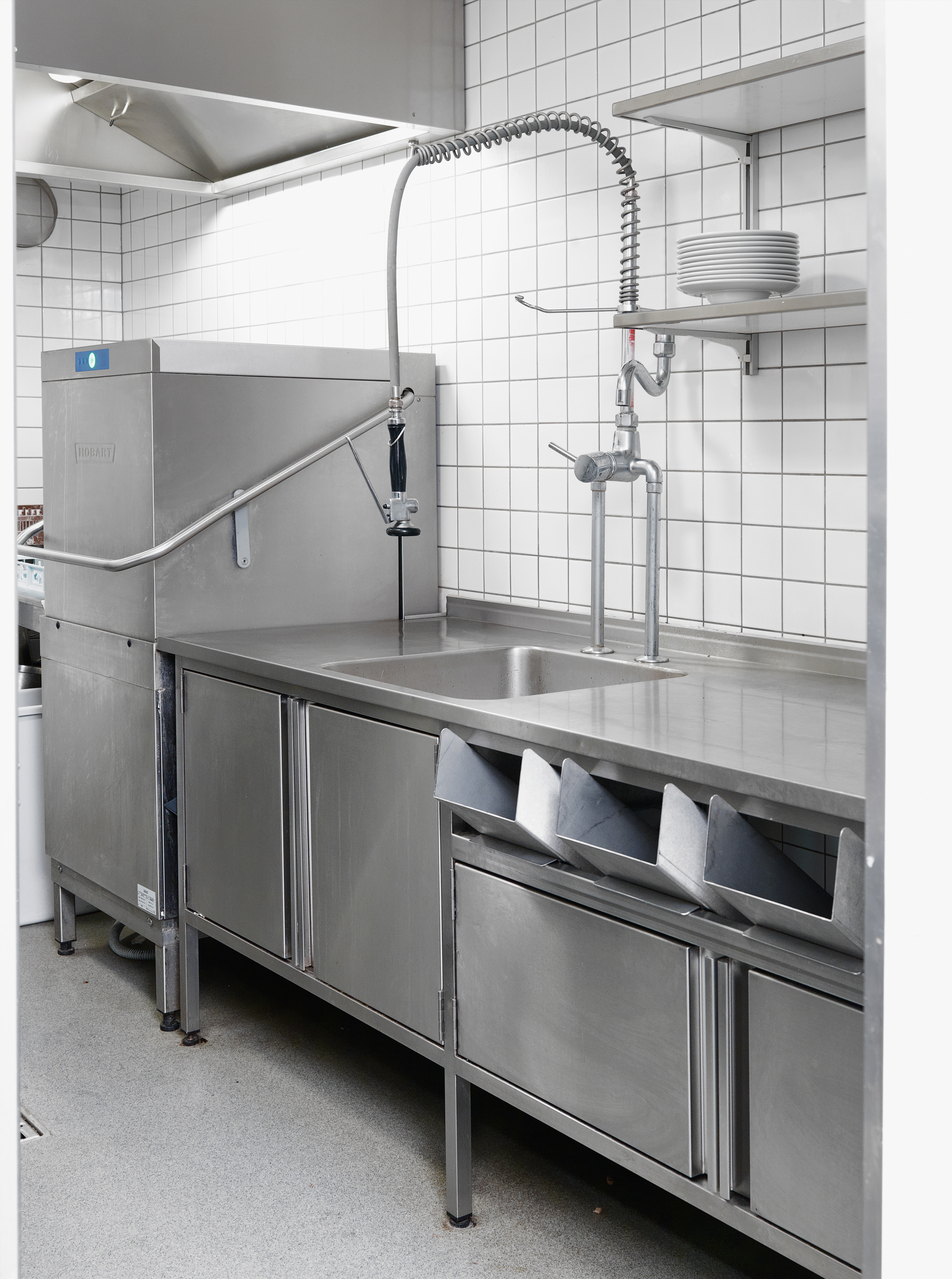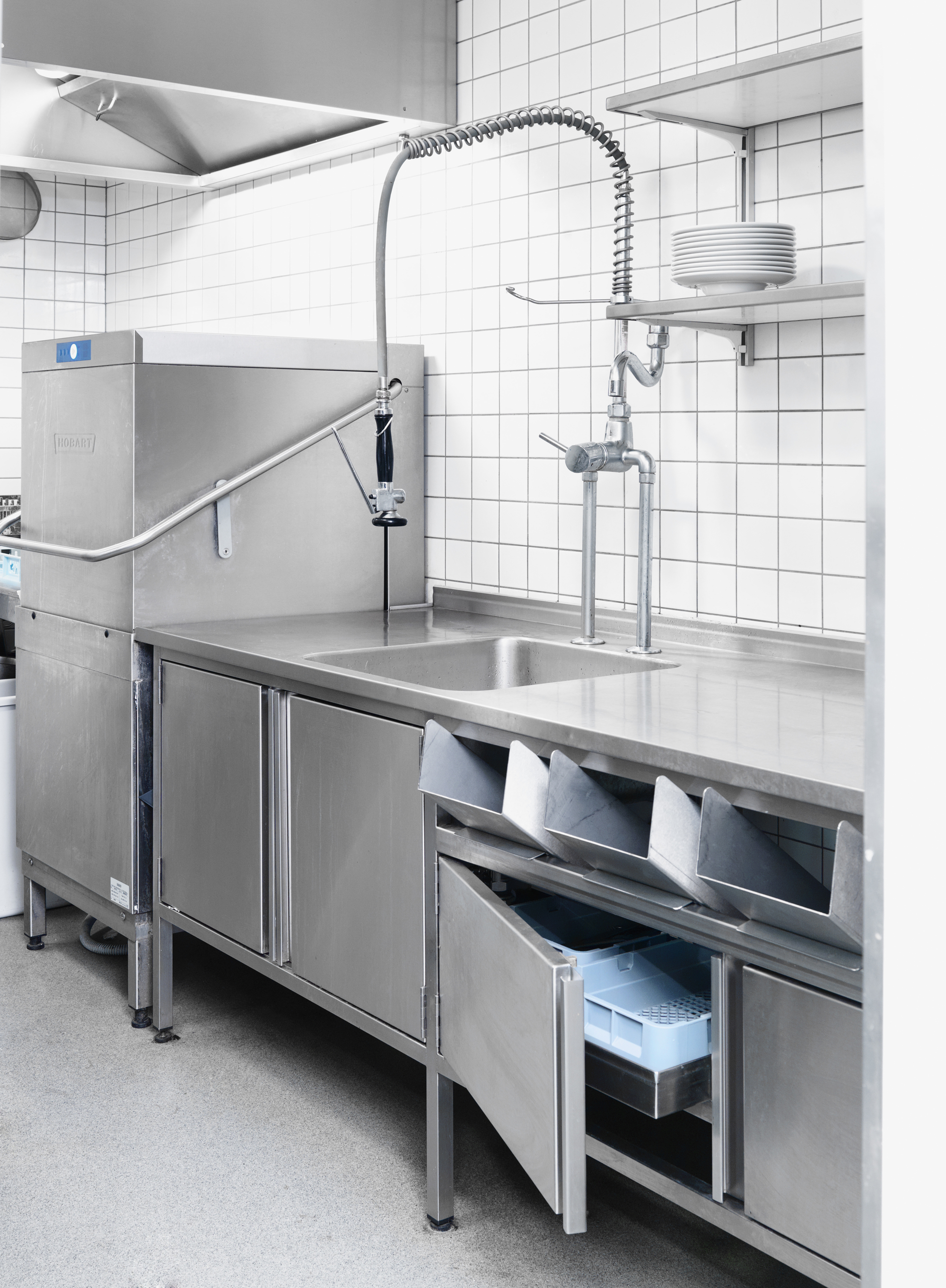 Bordet i opvasken er aflukket med låger og forsynet med slisker til opsortering af bestik.