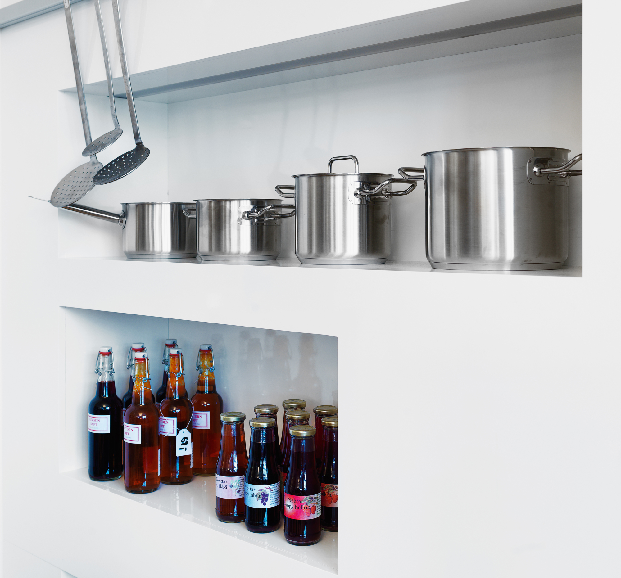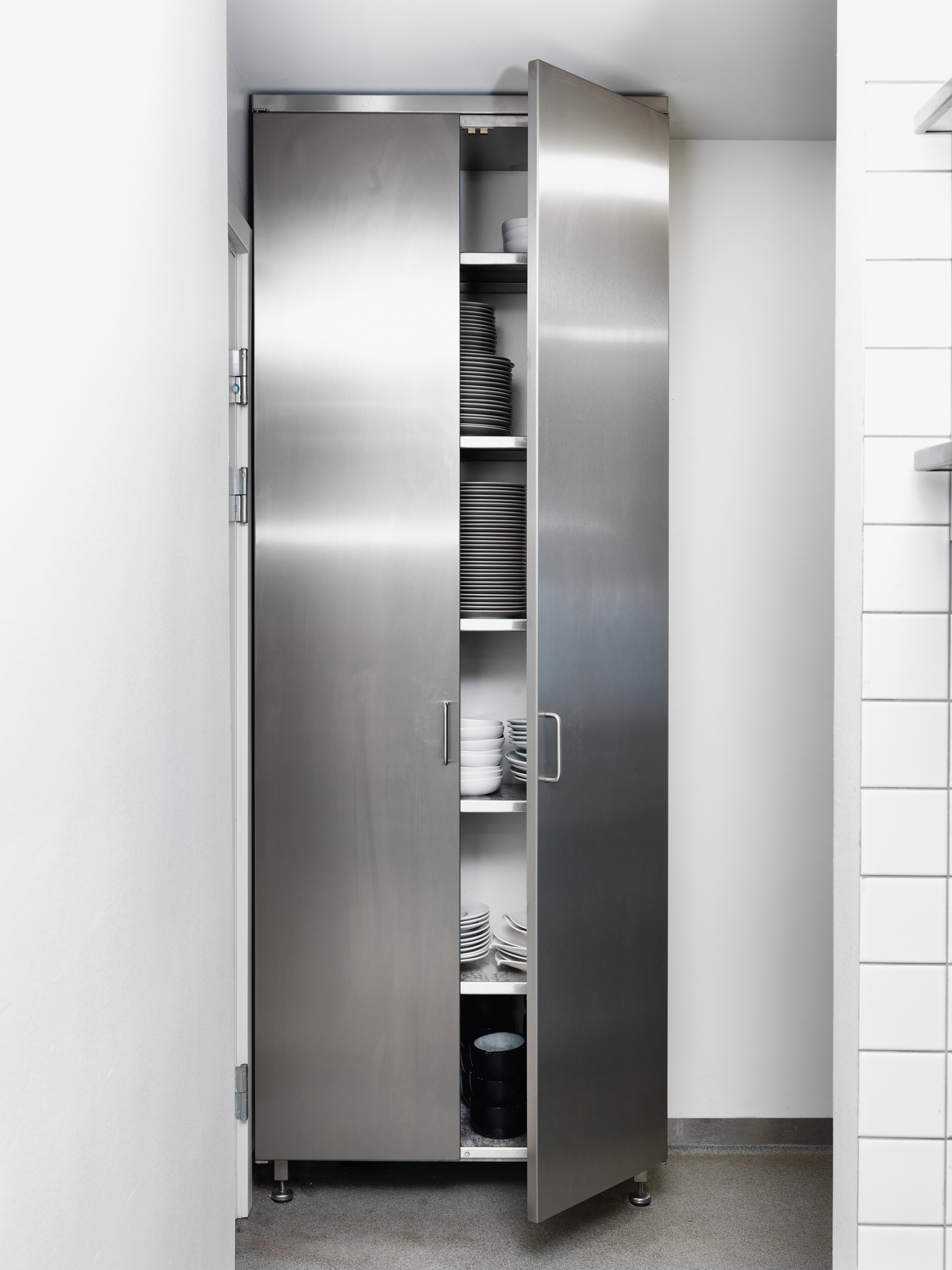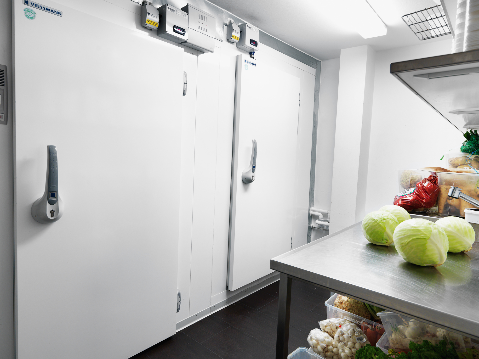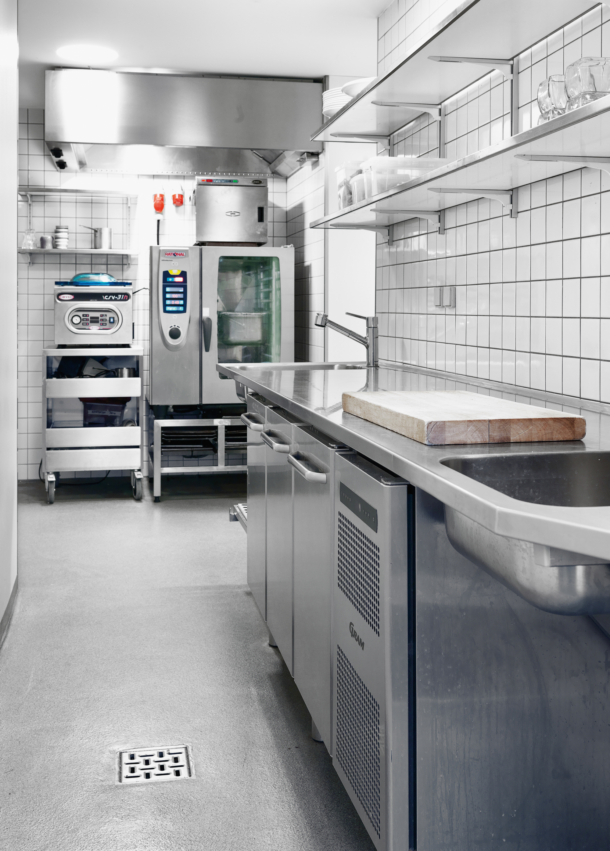 Tilberedningskøkkenet er placeret bag det åbne køkken og er med arbejdsbord, kølebord og ovn.