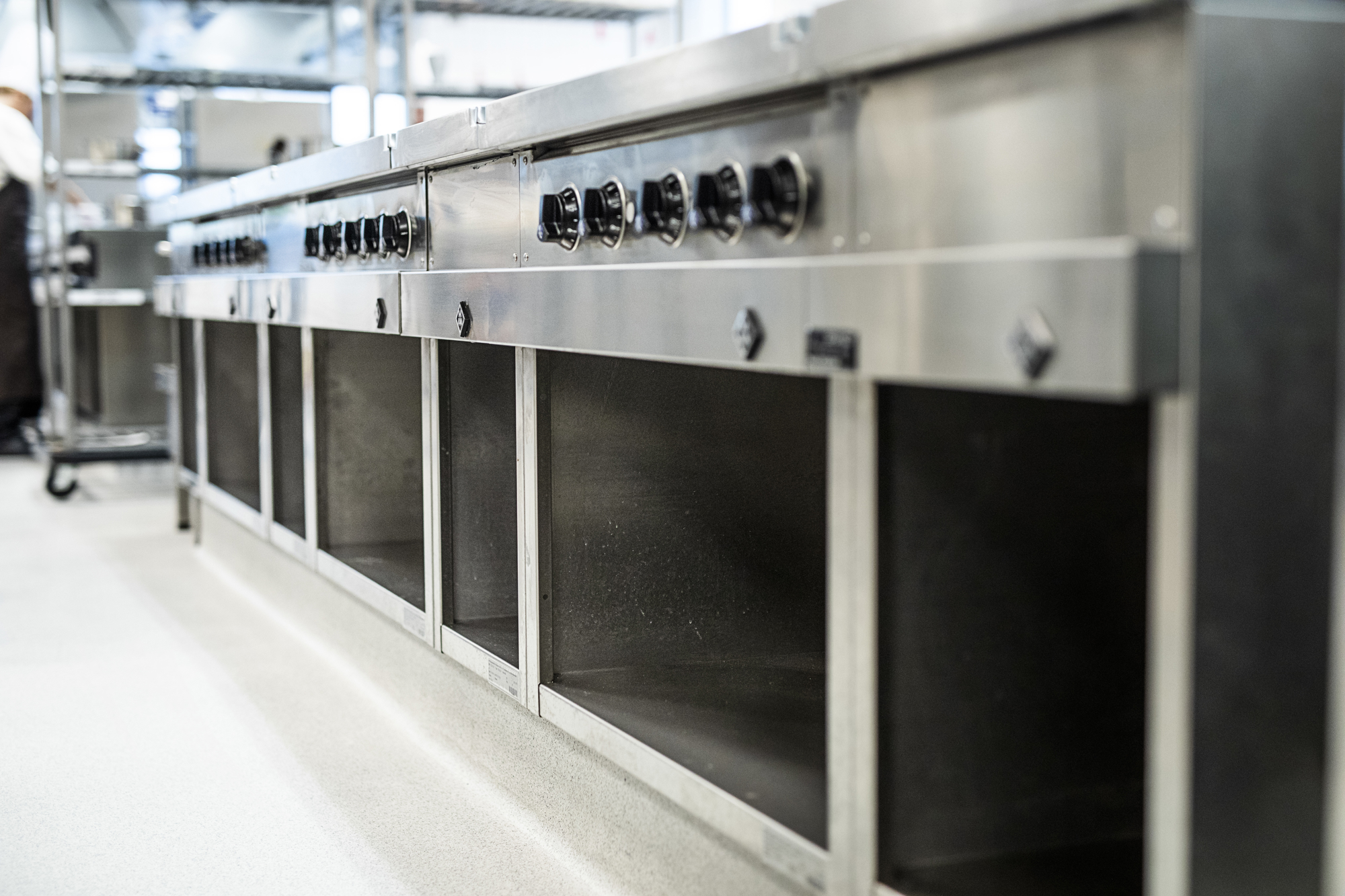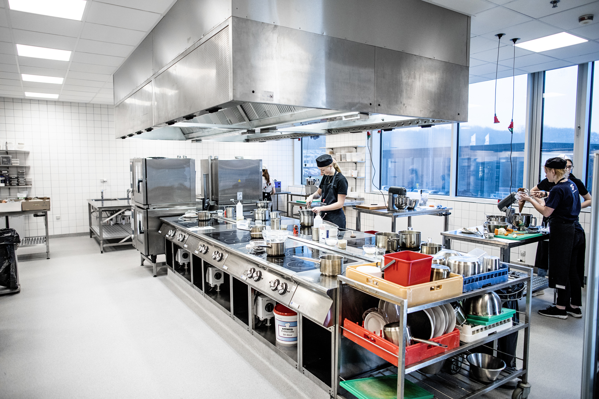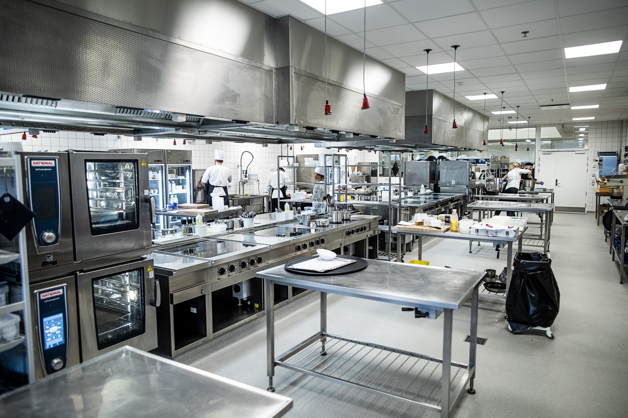Det er da også en temmelig stolt uddannelsesleder, der viser rundt i de nye køkkenfaciliteter, som er resultatet af flere års grundig forarbejde. Torben Bastrup Nielsen fortæller: ”Fra foyeren kan man følge arbejdet i det store svendekøkken, der har 2 kogeøer som centrum. Hver ø er udstyret med 6 fladedækkende MKN-induktionskogeborde suppleret af RATIONAL SCC-ovne. Rundt om øerne og langs væggene er der arbejdsborde med håndvask, køle- og fryseskabe, borde med småmaskiner og varmholdningslamper – og god plads.”