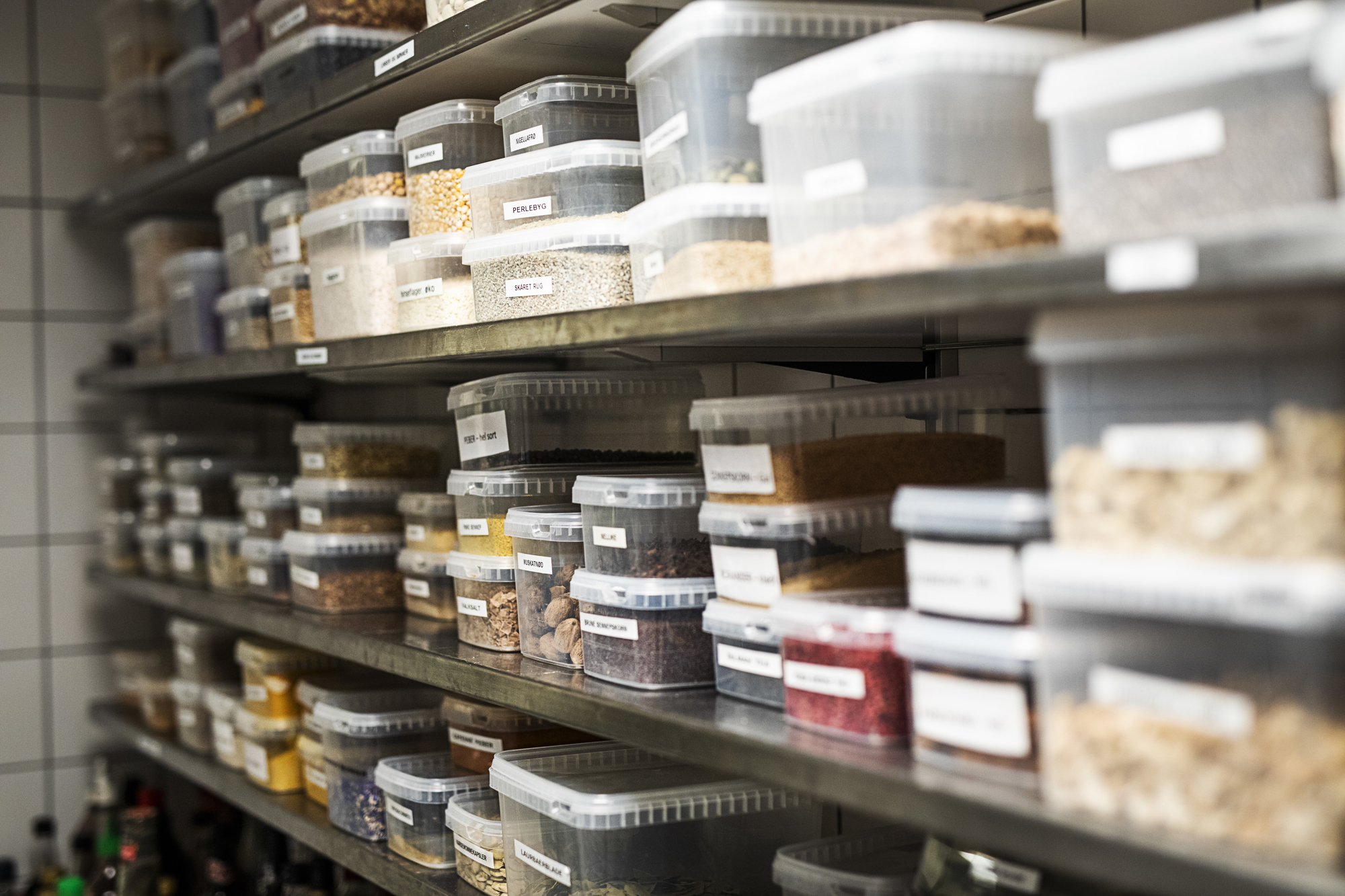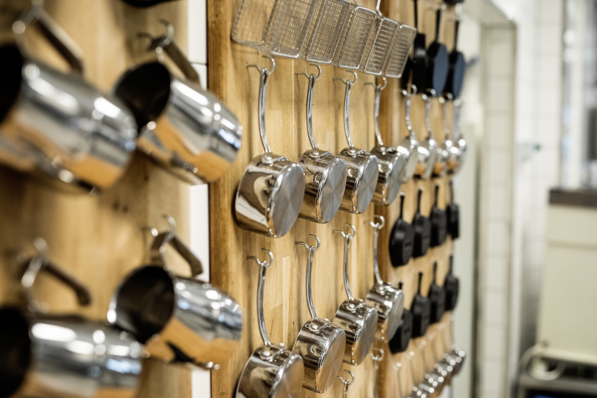 Faglærer Kathrine Pilgaard Ottesen, der har været dybt involveret i planlægningen, supplerer: ”Det har været vores mål, at alt udstyr skal være synligt, så man ikke skal bruge tid på at lede. Noget grej er – næsten som dekorationer – hængt op på væggene, mens det meste er systematisk placeret på masser af reoler, der i nogle køkkener fungerer som rumdelere.”