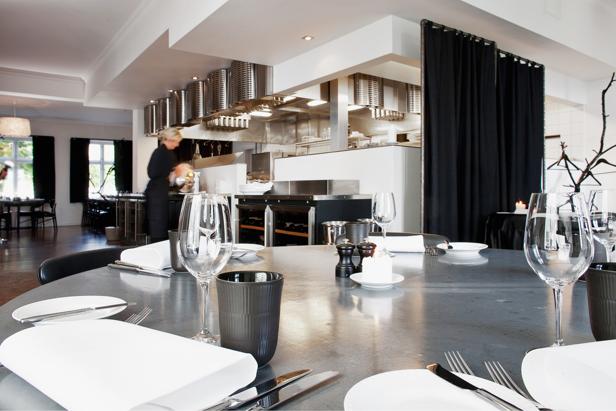 Åbent køkken med udsugning i hele arealet. Bordene i køkkenet har alle GN stik i underdelen og er integreret i køkkenet på murede sokler.